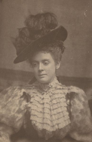 Curator: Standing before us is Félix Nadar's portrait, "Duchesse Marguerita De Madrid," taken in 1878. What strikes you most about this gelatin silver print? Editor: The austerity! The crisp, almost severe lines and the subject's...unsmiling demeanor create this sense of aristocratic distance. It’s beautiful but undeniably chilly. Curator: Nadar had a real talent for capturing the essence of his sitters, and he wasn’t afraid to show what others might try to hide. This image reflects the political realities of the time; perhaps we glimpse a stoicism born from the upheavals faced by European nobility. Editor: True. The Duchesse's clothing—the pearls, the ribbons, the elaborate dress—speak to a rigid social hierarchy, one built on displays of wealth and status, photographed by an artist well-known for his political cartoons critiquing power structures. Do you think Nadar subtly captured this tension in the Duchesse’s eyes? Curator: Absolutely, and it’s reflected in his focus on texture. Look at the rendering of the fabric, the almost brutal honesty of light and shadow! It is less flattering than perhaps traditional painted portraiture, no idealized softness here! Editor: Yes! It also makes you consider the physical burden these women bore. Her garments are exquisite but probably intensely uncomfortable! The weight, the restriction… it’s all communicated in the picture's static stillness. This form of capture makes me uneasy. What are your final thoughts about Nadar’s Duchesse, framed between worlds? Curator: I think he managed to trap her between social expectation and human personality, with perhaps a quiet plea for her dignity. It’s a stunning study of a woman navigating constraints, both imposed and internal.