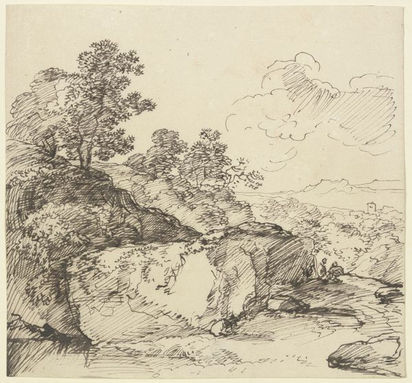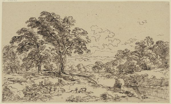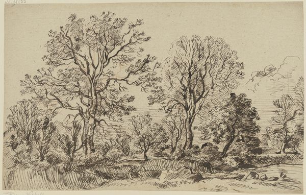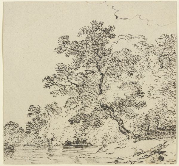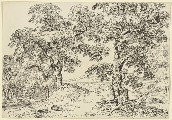 Curator: Looking at "Two Trees Left and Right of a Stream" by Franz Kobell, held here at the Städel Museum. What's your immediate take? Editor: It feels so…immediate. I can practically feel the hand of the artist moving across the paper. You can sense the material reality, the way ink bleeds slightly, the pressure applied. The whole thing breathes with this intimate presence, no? Curator: Absolutely. The image pulses with visual motifs – trees bracketing the brook create this portal into an idyllic space. This recurring "portal" formation invites you in and, historically, symbolizes passage into another, more profound level of consciousness or emotional connection with nature itself. Editor: Conscious or not, it’s a smart compositional trick. Visually enticing and likely fairly cheap to produce at the time. Tell me, do we know much about Kobell's process? This kind of landscape sketch would have been useful for any number of artisans needing patterns, prints or as part of a preparatory study. Was it purely artistic endeavor or functional? Curator: Most likely, a combination. Kobell’s approach reveals a confluence of factors: emerging landscape art trends, symbolic weight given to untamed nature, and personal fascination, no doubt! There is this underlying sense of nature as both a respite and reflection of the sublime. Editor: What I love about seeing art like this in a museum context is that we tend to forget how intensely handmade the early modern world really was. Before mass production, every mark here—that single wash of ink or the repeated etching to suggest form— speaks volumes. The image as evidence of work. Curator: That’s brilliantly observed, the act of creation, not merely a representation. I find this awareness transforms how one approaches this drawing—less about surface aesthetics, and more toward the labor and intention involved. Editor: It certainly makes me want to track down the specific ink Kobell was using; think about the paper; and how these factors may have changed through time. It makes you want to consider all the labor behind this piece that’s now on view as "Art". Curator: Precisely. And considering how landscape depictions shape collective identity and environmental awareness across generations only underscores its cultural and lasting weight. Editor: True. Looking closer at the techniques employed and what that communicates regarding its purpose is worth taking note of. Curator: Indeed. A reminder of the layered depths contained within this seemingly simple ink drawing. Editor: Well put.