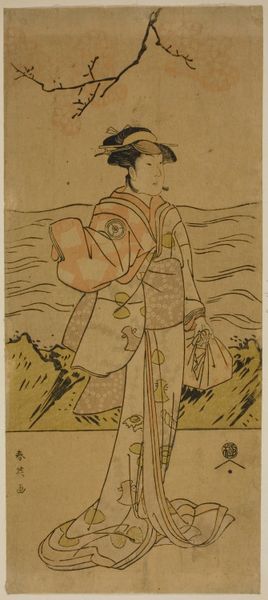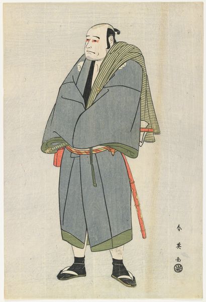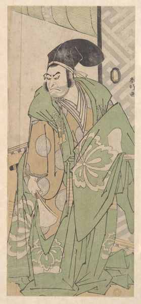 Curator: Oh, this one's got such a weight of feeling to it, doesn't it? Melancholy almost, with that plum branch hanging lonely above his head. Editor: We're looking at a print, a woodblock print to be exact, by Katsukawa Shun'ei from the 1790s. It’s titled "The Actor Ichikawa Omezo I." This piece is part of the Ukiyo-e tradition, and it presents a portrait of a prominent actor of the time. I see in it a potent symbol of celebrity and its connection to broader socio-political themes. Curator: Oh, the patterning on his robe is just mesmerizing. Like a maze he's wandering through himself, all those interlocking shapes. But celebrity… you know, to me, that somber face, he's not feeling much like a star at the moment. More like the weight of all those eyes on him. Editor: Absolutely. It’s important to remember that actors in the Edo period were often objects of both fascination and marginalization. Their identities were caught in a tension between popular acclaim and societal constraints. This particular pose, with the distant gaze and slightly downturned mouth, might reflect that inherent tension. Curator: Makes me think about the power of performance… to create and destroy at the same time. The woodblock technique, so precise, layering all these colors just right. Almost like building a mask, you know? Layering one truth over another. It does strike me that his expression suggests vulnerability under all the costume. Editor: Precisely. Shun'ei was known for his attention to detail and expressive portrayals of Kabuki actors. The art of Ukiyo-e isn't just about pretty pictures. It provides insight into social hierarchies, gender roles, and the ephemeral nature of fame itself. It makes one wonder how his celebrity impacted the social consciousness. Curator: That makes this image more haunting to me. It isn’t about documenting just the character, but also capturing the interior of someone caught in this strange game. To realize that what we’re seeing is only one layer and, maybe not the most revealing one… is quite captivating. Editor: Agreed. Reflecting on "The Actor Ichikawa Omezo I," it becomes evident that this work invites us to critically examine the multifaceted roles of artists and performers and understand the subtle nuances in the art from that period.