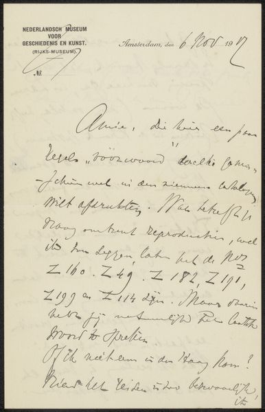 Editor: Here we have "Brief aan jonkheer Hendrik Teding van Berkhout (1879-1969)," or "Letter to Esquire Hendrik Teding van Berkhout," possibly from 1932, created by Jakob Nieweg using pen and ink on paper. It looks like a handwritten letter, almost like a draft. What jumps out to you about this piece? Curator: This letter offers a glimpse into the artist’s world and raises questions about class and artistic patronage. Letters, especially handwritten ones, can act as direct lines into the societal structures and personal relationships that shaped artistic creation. Who was Hendrik Teding van Berkhout? What was his position in society? Understanding the relationship between Nieweg and van Berkhout could shed light on the dynamics of power and support within the Dutch art scene during this period. Does the content of the letter hint at Nieweg’s financial situation or reliance on patronage? Editor: I see what you mean. It's easy to view it as just a simple letter, but contextualizing the receiver adds layers. What’s interesting to me is the mention of “lithos." Is Nieweg potentially discussing business? Curator: Exactly. It speaks to the practicalities of artistic life. Letters like this aren’t just personal correspondence; they’re also documents of labor, negotiation, and economic survival within a capitalist art system. Considering that 1932 fell within the Great Depression, the mention of prices and a possible discount hints at financial pressures impacting both artist and patron. Does the language used indicate a formal business arrangement, or something more personal? Editor: It’s really interesting to consider it as a negotiation within a specific socio-economic context. I initially saw just handwriting; now, I see the complexities of the art world reflected in this simple document. Curator: Precisely. By analyzing these everyday interactions, we can unearth the hidden power structures and economic realities that influence artistic production and reception. Every stroke of the pen, in this light, becomes a deliberate act within a larger societal framework.