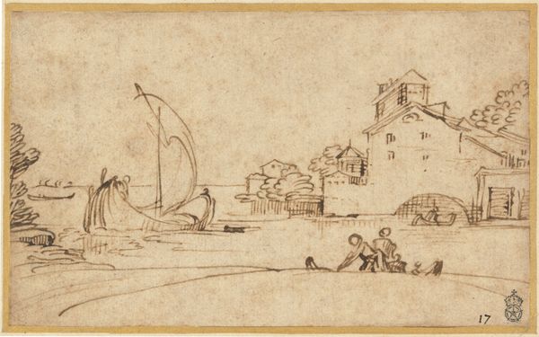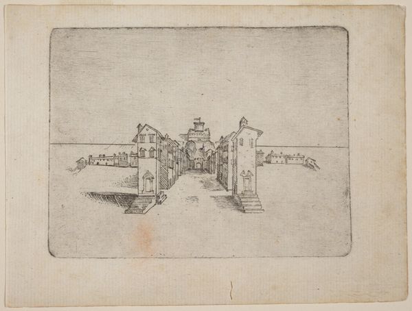 Curator: At first glance, there’s almost a dreamlike quality to this seascape. The etching and engraving techniques create delicate lines. Editor: We’re looking at “From 'Bizzarie di varie Figure'”, a work by Giovanni Battista Bracelli, dating back to 1624. Bracelli worked during the Baroque era, and the print showcases his inventive approach to the cityscape. Curator: The city walls and fortifications definitely dominate. You can almost feel the weight of the stones and mortar despite the lightness of the etching. It makes me think about the availability and quality of engraving materials back then and how those conditions shape the image. Editor: Absolutely, the construction of those cityscapes would have demanded considerable resources and labor. But Bracelli’s Bizzarie, or "fanciful inventions," were designed to inspire the theaters' set and costume designs of its day. It’s interesting to see how architectural elements take on almost theatrical presence when contextualizing the place in Baroque period spectacles and societal needs of self representation. Curator: Considering this work as inspiration for stage design is interesting, because you are completely right about its performative nature. Are those rocks in the foreground arranged for strategic defense or do they serve more for an exercise in form? Editor: Perhaps both. The role of imagery in reinforcing social hierarchies was pronounced during that period. These images served an ideological function for civic and even military strength, regardless of function. The visual arts have always contributed in different layers, depending on socio-economical environment of its moment. Curator: Reflecting on it now, I see both a sense of careful production alongside Bracelli's freedom in execution, blending solid construction with playful exploration of form. Editor: Indeed. It's a testament to the era, revealing social values embedded within architectural and artistic endeavors.