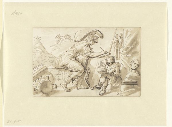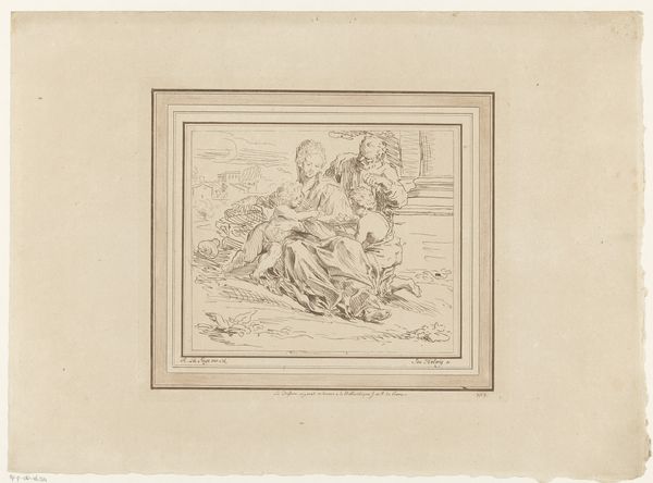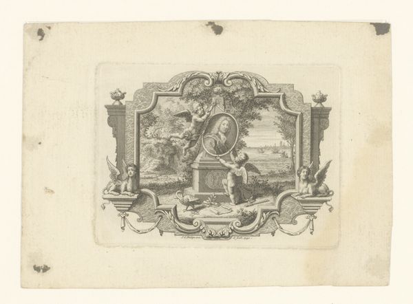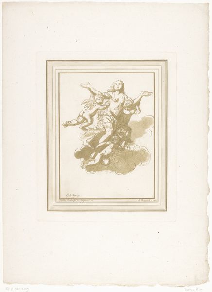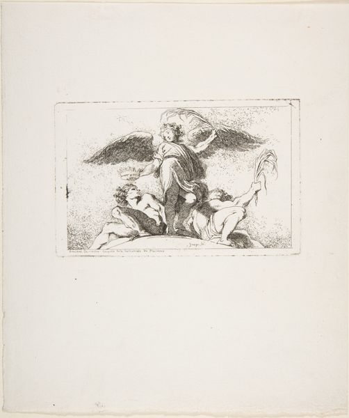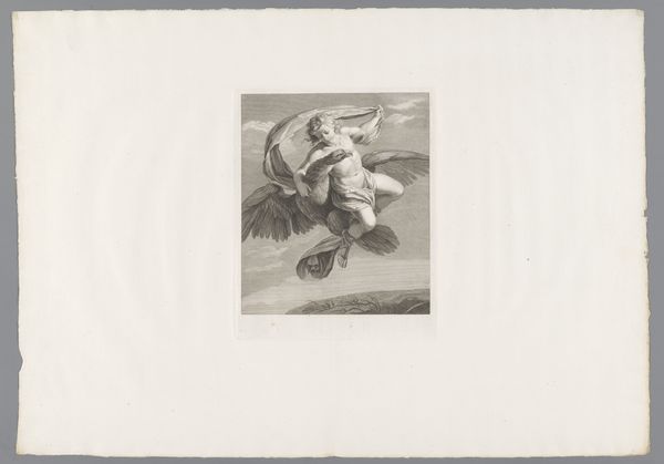 Curator: Alright, let’s discuss this striking print: "Engel met bazuin op een wolk met boeken," or "Angel with Trumpet on a Cloud with Books," by Bernard Picart, dating from around 1715 to 1717. Editor: My immediate thought is that this cherubic figure, seemingly weightless on a cloud of ideas, seems a bit…stuffy? All those books and that rather serious expression, makes the trumpet feel more like an announcement of obligations than joy. Curator: Well, looking at it through a formalist lens, notice the allegorical structure, blending classical and baroque elements. The composition emphasizes the symbolic value of each element. Books for learning, the trumpet representing enlightenment. Editor: I get that! And I adore the engraving technique – so detailed yet ethereal! But artistically, does it really sing? It feels a little contrived. I think what is odd about the books is they act like steps or a platform - it just takes me away from feeling the lightness you might associate with an angel floating on clouds. Curator: Contrived? I think it's quite masterful. The contrast of light and shadow, created by Picart's skilled engraving, brings a dynamism that's hard to ignore. Each line has meaning in delineating form, particularly when considered from a semiotic perspective in considering how symbols reinforce meaning. Editor: I suppose so, the texture in the clouds *is* beautiful. The cross-hatching technique almost feels modern for its time, doesn’t it? I wonder, what sort of message was Picart aiming to transmit in a society ripe with scientific revolution? Curator: Maybe that the dissemination of knowledge comes with a divine pronouncement. What do you think that the use of allegory here suggests about the artist's worldview and societal values in the early 18th century? Editor: Hmmm... that the pursuit of knowledge is a celestial quest, but also one needing some serious effort given how grounded and book-heavy this angel appears! This discussion does make me see more of the piece's intentionality.