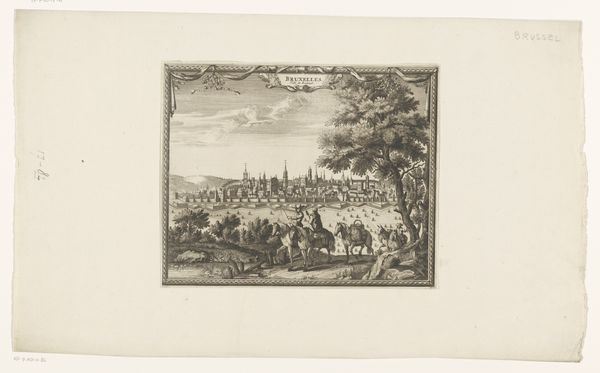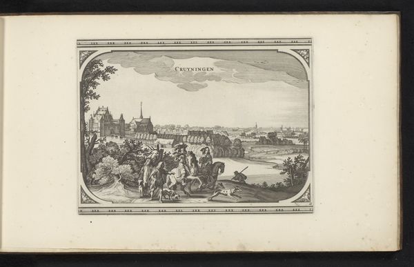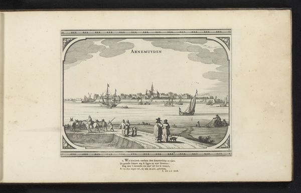 Editor: Here we have Pieter Hendricksz. Schut's "Gezicht op Biezelinge" from around 1662, rendered in ink on paper through engraving. I'm immediately struck by the contrast between the detailed foreground figures and the almost dreamy cityscape in the background. What do you make of this piece? Curator: It's a powerful depiction, isn't it? This engraving offers more than just a view; it’s a snapshot of the social hierarchy of the Dutch Golden Age. The detailed foreground figures, likely common townsfolk, are placed in stark contrast to the idealized depiction of Biezelinge in the background. Editor: So you're saying the placement of the figures isn't just about perspective? Curator: Exactly. It's about power dynamics. Consider how the artist chooses to highlight these everyday individuals against a backdrop of prosperity. It almost invites us to question who benefits from this 'golden age' and who is simply working within it. Notice how their activities suggest labor, suggesting their placement is deliberate, perhaps even a subtle commentary on social inequity. Editor: That's fascinating. I hadn't considered it in terms of social commentary. Now that you mention it, the figures do seem almost… isolated, despite being grouped together. Curator: And what do you think their expressions convey? Do they strike you as participants or observers in this depiction of “success”? Do they even look as though they feel a sense of belonging or opportunity in this flourishing society? Editor: Now that I think of it, they all appear so grave. There's little interaction, like they are all enclosed in their own worlds. That's incredibly powerful when viewed through this new lens! Curator: Indeed. And it urges us to see the piece not just as a historical document, but also as a complex negotiation of identity, labor, and social standing within its time. Editor: I'll never look at another cityscape quite the same way again. Thank you for providing that very important context!