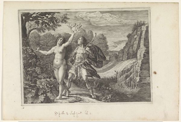 This engraving was created by Dirck Volckertsz Coornhert sometime in the 16th century. The artist skillfully used metal plate engraving, a printmaking process that requires considerable labor. A design is incised into a metal plate, in this case copper. Ink is then applied to the plate, and then wiped clean, leaving ink only in the engraved lines. The plate is then pressed onto a sheet of paper, transferring the image. Here, we see the allegorical figure of Fortune, rendered as a nude woman, confronting a soldier. The sharp, clean lines of the engraving lend a sense of starkness to the scene, emphasizing the futility of the soldier's shield against the whims of fate. The process itself, etching line by line, mirrors the laborious, often frustrating, efforts of humans to control their destinies in the face of larger forces. Coornhert's choice of printmaking, a relatively accessible medium even in the 16th century, suggests a desire to disseminate his philosophical message widely, democratizing access to these complex ideas. This print stands as a reminder that even the most skilled craftsmanship can be employed to explore profound social and philosophical themes, blurring the lines between art, craft, and intellectual discourse.