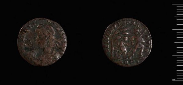 Editor: Here we have an Antoninianus, a coin featuring Diocletian. It looks so worn, as if time itself has smudged the details. What stories do you think this little bronze disc could tell? Curator: It whispers tales of empire, doesn't it? Imagine the hands it passed through, each transaction a tiny echo of Diocletian’s vast reach. It's a humble object imbued with immense power; a symbol of control reduced to pocket change. What do you think the image on the coin says about Diocletian’s priorities? Editor: Perhaps strength and prosperity? It’s amazing how much history can be packed into something so small. Curator: Absolutely. And how much it can make you think about our own place in history, and what pocket change of our own we might leave behind.