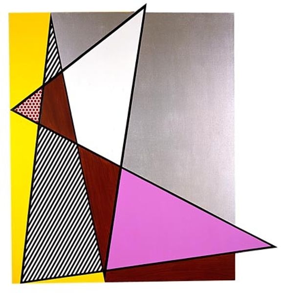 Curator: Oh, my, this piece feels incredibly… assertive. The sharp angles and bold, flat colors hit you immediately. Editor: Indeed. What you’re seeing is Roy Lichtenstein’s “Perfect Painting #1,” created in 1985 using acrylic paint. Lichtenstein, of course, is deeply embedded in the Pop Art movement. Curator: Right, that becomes immediately apparent, it's unmistakable! But what exactly is Lichtenstein trying to communicate? The term "perfect painting" reads as supremely ironic considering the seeming visual chaos. Editor: That's precisely what makes Lichtenstein so compelling. He challenges our preconceived notions of "high" art. We have to consider how, by appropriating the aesthetics of commercial printing—the Ben-Day dots, the flat colors—he disrupts the art world establishment. How it democratized imagery. It suggests the role that media representation had in our lives in the 80s, but perhaps it feels more relevant today. Curator: Absolutely, especially through a lens of race and class! The fact that these aesthetics are derived from mass media, historically controlled by powerful interests. It becomes more a subversive act that allows working-class iconography into privileged gallery spaces. But still… it is incredibly visually busy; is the lack of clear subject a rejection of traditional art narratives? Editor: I believe so. Lichtenstein engages with abstract art’s legacy, specifically geometric abstraction, which had very definite cultural implications through its use as interior decor for white bourgeois spaces. This is like, meta abstraction—abstracted abstraction! What does it mean to claim the space? Curator: Interesting. The boldness could also be interpreted as an act of defiance against art historical conventions… appropriating the high modernist styles of suprematism. Lichtenstein seemed like he was actively reinterpreting and even satirizing male-dominated movements through a Pop Art filter. Editor: Precisely. It becomes clear through his engagement that Pop Art served a powerful critique of these artistic legacies. This reinterpretation opens a space for conversations on art, culture, and society. I think a key piece here, perhaps the defining piece, is not merely the work's immediate impact, but the ripples of conversation and discourse it creates. Curator: Very true, viewing “Perfect Painting #1” has certainly nudged me to re-examine the familiar framework, in the sense of our culture in this case, art for the people, or against the people. Editor: Exactly, I agree. Its placement into society changed things. Lichtenstein makes you confront uncomfortable yet relevant aspects.