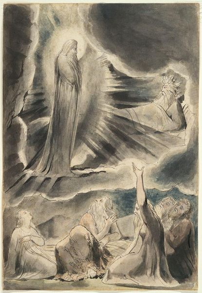 Curator: Albert Edelfelt’s 1899 charcoal drawing, "Revelation of Angels to Shepherds", offers us a fascinating glimpse into a popular biblical scene through a Romantic lens. Editor: Wow, it just sweeps you away, doesn’t it? The angel practically vibrates with light, and you can almost feel the shepherds’ awe. It’s so… dreamlike. Curator: The use of charcoal allows Edelfelt to manipulate light and shadow so masterfully, right? Consider how the luminosity of the angel is achieved not just through highlighting but by contrasting her against the darker, earthier tones of the shepherds. Charcoal as a readily available and inexpensive material allowed the production of studies and preparatory drawings, informing larger, possibly oil painted, finished works. Editor: I keep thinking about that angel, the way she seems both solid and ephemeral. It makes me wonder, did Edelfelt believe in angels? Was he trying to capture something real, or just the feeling of divine intervention? There is a definite emotional intensity at work here. Curator: Well, this piece arrives towards the tail end of Romanticism, so it would have spoken to ideas about intense subjective feeling and perhaps sought to capture some form of collective cultural psyche about biblical stories. I find it striking that Edelfelt chose to represent this monumental spiritual moment through the accessible medium of charcoal—bridging high art with everyday materials, highlighting process and making. Editor: True. I'm drawn to how small the shepherds look, literally and figuratively. There's such a sense of human insignificance alongside otherworldly glory. But isn’t it interesting how charcoal can be both so basic and capable of conveying this really elevated spiritual experience? It seems humble, somehow fitting. Curator: Absolutely. In conclusion, by thinking through material choice, and the economic considerations involved, this work invites us to meditate not only on the divine event it portrays but also on art’s capacity to materialize intangible ideas using elemental means, democratizing the very idea of divinity itself through a mass-producible material like charcoal. Editor: Yes, and personally it is Edelfelt's emotional rendering here that stays with me most powerfully: an ethereal glimpse into something ancient, primal, deeply human.