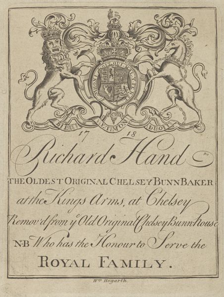 Curator: This printed book label, designed for Mrs. Judith Hackam, dates roughly from 1731 and exemplifies decorative art with its intricate design elements and typography printed on paper with etching. What strikes you most when you first see it? Editor: The scale is deceptive—I’m initially drawn to the texture, like faded linen or textile rather than just paper. The weight of its materiality really evokes a sense of handling and age. Curator: Absolutely. And what layers are presented by its existence, the claim of ownership embedded in it, who Mrs. Hackham and Richard Hill might have been, as suggested by the placement of their names, can we speak of literary authority in the 18th Century? Editor: It certainly shifts my focus from solely aesthetic consideration towards issues of craft, ownership, and, perhaps, privilege as associated with reading and book ownership. I’m curious about the Clarendon Printing-House’s operations at that time; what did it mean to brand oneself as their customer? Curator: Precisely. The label intertwines personal identity with a larger socio-political narrative involving the distribution of printed materials and knowledge. Considering Mrs. Hackam as a reader also complicates our understanding, does it speak of status, accessibility, of even gender empowerment. Editor: I agree; examining its context illuminates not only printmaking technologies but also the socio-economic structures shaping consumption and literacy, especially as it touches upon questions of identity and belonging to literate culture. Curator: Indeed, it goes far beyond mere ornamentation; it signifies cultural shifts in literacy, the development of personal branding and the complex narratives surrounding reading, especially when viewed through feminist lens. Editor: Analyzing this book label as more than decorative but a signifier of Mrs Hackam's involvement in cultural and economic systems of knowledge broadens the context through which we can see materiality influencing the narratives present and how materials help define one's placement within those narratives. Curator: Ultimately, such inquiries bring richness of perspective, it goes beyond just design considerations of typography, which brings broader socio-political meaning embedded. Editor: Exactly; understanding this humble object within its production chains expands how we connect this era and see materiality being bound to identity in many forms.