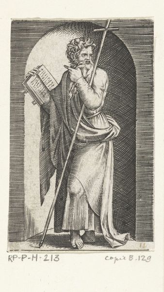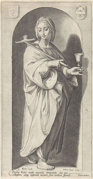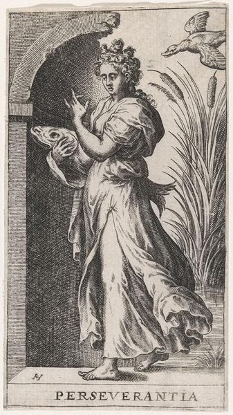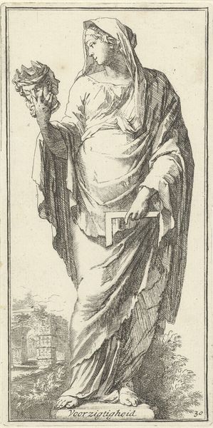 Editor: Here we have Jacob Matham's "Prudentia," or "Voorzichtigheid" in Dutch, from 1593. It's an engraving, and the level of detail is just astounding. I'm really struck by the woman’s serene expression, juxtaposed with the snakes she’s holding. What exactly am I looking at here? Art Historian: This engraving is indeed rich in symbolism, and loaded with visual metaphors! As an Iconographer, the snakes in Prudentia's hand immediately draw my attention. In Western art, snakes have had a dual meaning since antiquity; here they are attributes, symbols of wisdom and caution, a measuring of action and potential consequences. What other details stand out for you? Editor: Well, there’s a radiant eye at the top left and a mirror-like object at the top right within arches. Are those also symbolic? Art Historian: Precisely! The radiant eye, or 'eye of providence' reminds us of awareness and the ever-present observation. The mirror, an ancient symbol, asks Prudentia, and ourselves, to inspect the consequences of our actions as they are reflected into the future. All these symbols ask the viewer to use sound judgement, a central concern during the late Renaissance and the Mannerist art movement. Why do you think prudence was such a prevalent theme during that period? Editor: Perhaps because of all the religious and political upheaval? It seems like everyone needed a reminder to think before they acted. I see what you mean; looking at the details adds so many layers to understanding the work. Art Historian: It is amazing that Matham brought all of that into a single image! These visual tools created pathways of collective cultural memory for their audiences. Thinking about this, how can the idea of ‘Prudentia’ still be relevant in today’s world? Editor: Good question... I suppose in a world of instant information, maybe we should all be a bit more 'Prudent.' Thank you, this has really changed how I see this artwork!