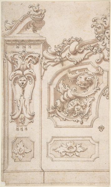 Editor: This intriguing ink drawing, “Sheet with Various Studies of Candelabra Grotesques, Foliage and a Cartouche," was created by an anonymous artist sometime between 1500 and 1700. The sheer density of ornamentation is what strikes me. How do you even begin to decode this visual language? Curator: Well, look at the repeated motifs – the foliage, the grotesque figures. They're not just decorative; they speak to a worldview. The grotesque, especially, becomes popular again during the Renaissance – a visual release valve, a space to explore the absurd and the irrational after periods of more constrained artistic expression. Doesn't the constant, playful return of plant forms echo life's tenacity? Editor: So it's like a controlled explosion of visual ideas? Does the combination of organic and bizarre elements reveal something about the cultural memory it carries? Curator: Precisely. Think about where these designs might have been used – perhaps in elaborate architectural settings or ceremonial objects. The cartouche, for instance, typically held inscriptions or heraldic symbols. By surrounding these spaces with the fantastic, were they elevating or subverting traditional power structures? Ask yourself that question when you walk through the halls of this very Museum! Editor: It’s amazing how much meaning is packed into something that, at first glance, just looks decorative. Were these images used over and over again? Curator: Definitely. There's a sense of continuity here, of forms being reinterpreted and passed down through generations. This constant reshuffling creates powerful symbols, echoing societal themes across decades. Editor: It sounds like even a doodle can have cultural significance. Curator: Indeed. Each swirl and flourish holds the potential to unlock hidden meanings. Hopefully you will come across objects with familiar flourishes as you walk through this collection, building a deeper appreciation!