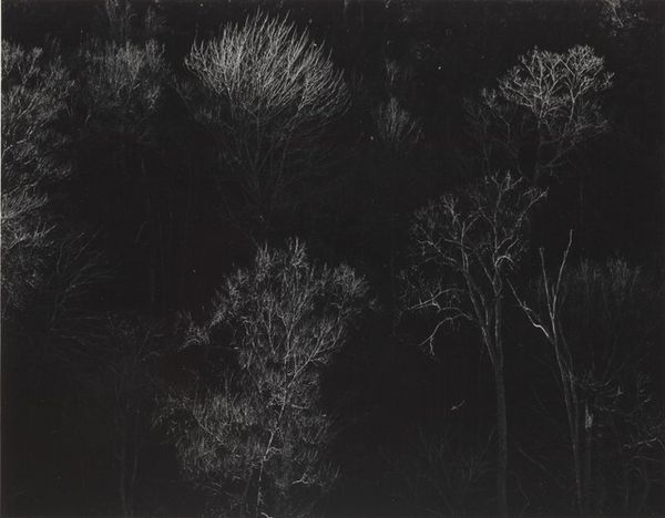 Nathan Lerner made this gelatin silver print, "Night Branches," at an unknown date. It features a composition of thin, white branches against a dark, blurry background. The photograph's high contrast evokes a sense of mystery and isolation, yet the natural subject matter also points to a potential commentary on urban life. In the context of the mid-20th century, when Lerner was active, such nature photography could be seen as a subtle critique of the increasingly industrial and artificial environments of modern cities like Chicago where he lived. The decision to focus on the overlooked, nocturnal aspect of nature might reflect a broader cultural interest in finding beauty in the everyday and unseen, challenging the dominant aesthetic values promoted by art institutions. Understanding Lerner's work requires us to consider the social and cultural values attached to nature and urban life during his time. By examining period publications, exhibition records, and critical writings, we can better appreciate how this photograph participates in broader discussions about the relationship between humanity and the natural world.