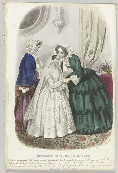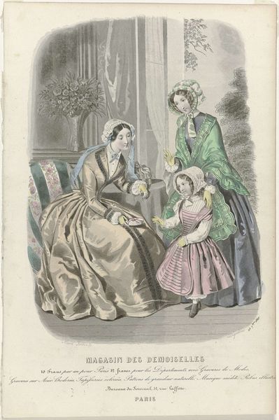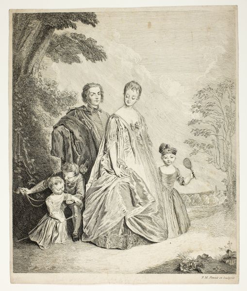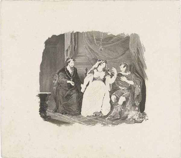 Curator: This is Hendrik Jacobus Scholten's "The Sick Grandmother's Birthday," likely created between 1834 and 1907. The medium appears to be pencil and charcoal on paper. Editor: A melancholic scene. The grey tones soften the otherwise stark narrative of illness; there's an undeniable quiet sadness emanating from this drawing. Curator: The artist's control of light and shadow, created with pencil and charcoal, models the figures masterfully, look how light defines the contours of the grandmother's face and gown. Compositionally, Scholten is doing interesting work setting up diagonals that converge on the grandmother's resting place. Editor: Indeed, the artist has captured a familial scene loaded with unspoken social and gender dynamics. Consider the rigid figure of the man, detached, almost as a structural support in the frame—versus the clustering of the women. What stories of labor, domesticity and the interior lives of women in this era are conveyed in their bowed heads, the supportive embrace around the grandmother? Curator: It’s the attention to texture that strikes me—from the lace details on the women's dresses to the bed linens. And that wonderful little girl with her elaborate hat—notice how Scholten differentiates surface through skillful layering and hatching techniques with his pencil. Editor: And look at the positioning of that girl! The flower basket, likely symbolic, acting as an offering but also a barrier between childhood and the grim reality of illness and the aging female body. How were women’s bodies medicalized and othered at the time, placed as subjects in private sick rooms? It speaks to a legacy of care-taking—particularly the burdens placed on women as they age and become infirm. Curator: I'm interested in the way the artist captures an interiority in each figure, rendered beautifully through nuanced pencil work that allows us to infer the complex internal state of these individuals within this confined space. Editor: It's remarkable how much narrative tension and complexity Hendrik Jacobus Scholten renders in a simple genre scene through strategic framing, textural variation, and thoughtful representation of individuals enmeshed within a tight network of familial expectations and gender roles.