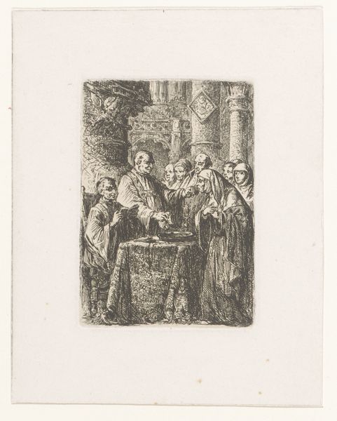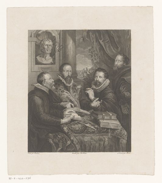 Editor: Here we have Rembrandt’s "Self-Portrait with Saskia", a small etching from 1794. It has an intimate feel; you get a sense of peering into Rembrandt’s personal life. What stands out to you about this piece? Curator: It’s fascinating how Rembrandt constructs his public image through these self-portraits, particularly within the context of the 17th-century Dutch art market. Printmaking allowed for wider distribution, creating a form of celebrity, almost like early modern social media. What do you make of his choice to include Saskia in this depiction? Editor: I see it as an attempt to portray himself as a successful and content family man, perhaps? Although I find the two other figures intriguing because they are not identified! Curator: Exactly! Consider the rising merchant class in the Netherlands at the time. The art market shifted from aristocratic patronage to a broader public. Self-portraits like this, subtly advertising his skills while projecting an air of bourgeois respectability, played into that shift. The additional figures could represent societal archetypes or even potential clients, contributing to a constructed image carefully designed for public consumption. How do you think its small size affects our experience of it today? Editor: That’s a good point – the scale creates a sense of accessibility now, almost like a snapshot. Thinking about it as a carefully crafted public image for the rising merchant class adds so much depth to the piece! Curator: Indeed. Looking closely at these pieces tells us so much about both the artist and the society that supported them. Editor: I definitely see this work in a new light, now. Thank you!