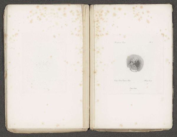 Curator: Before us we have "Munt", a print made before 1886, credited to Maurice Boudet de Paris. It appears to be ink on paper. Editor: My immediate impression is one of austerity. The portrait seems quite small relative to the expanse of paper surrounding it. The limited tonal range reinforces this restrained mood. Curator: Yes, and consider the object itself - an open book. On the right is what appears to be an engraving of a coin, with the profile of a gentleman. Note how precisely the details are rendered, reflecting academic conventions in the 19th century. The paper’s aged and somewhat stained surface provides further material contrast. Editor: Precisely. The decision to frame this image as part of a bound volume speaks volumes, doesn’t it? Perhaps a study of currency and its symbolism? This adds another layer, positioning the figure as not merely a portrait but an emblem of authority, contained within a controlled system. Curator: Furthermore, look closely at the opposing page. There appears to be another fainter design of similar execution style. The two combined offer us symmetry, drawing our eyes to a narrative connection between each facing. Editor: It prompts one to question the intent: to immortalize a specific ruler through currency, or to explore the very nature of power through representative images, thus contributing to a larger political narrative. This pre-photographic age held its authority tightly within these visual confines. Curator: Absolutely. It serves as a valuable artifact, revealing a specific approach to artistry that was integral to academic art of its time. The very constraints become significant components of the piece. Editor: On reflection, I now understand that the formal simplicity enhances rather than detracts from its effect; that the muted quality creates more intellectual resonance in viewing the interplay of power and representation within that historical framework.