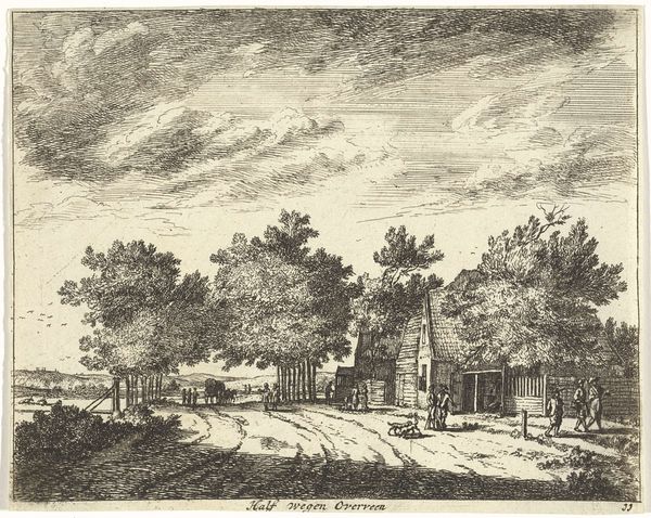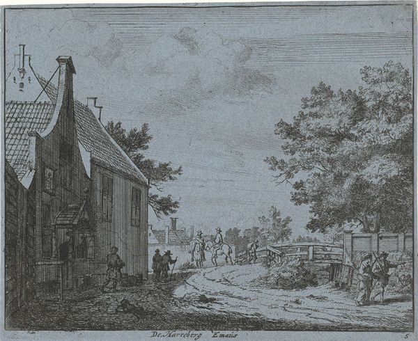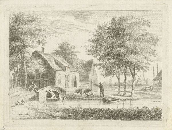 Curator: Here we have "Gezicht te Katwijk Binnen," a cityscape created by Paulus Constantijn la Fargue in 1778. The work is crafted with ink and etching on paper. Editor: My first thought is how the artist uses light. The linear strokes give a certain structure, while also offering a diffuse glow to the foliage. It feels...balanced. Curator: Balance is a good word. This piece reflects the Neoclassical movement’s values of order and clarity. Look at how La Fargue captures daily life while framing it within an ordered architectural setting. There's a moralizing aspect, presenting the viewer with an idealized view of society, in contrast to what were more tumultuous times. Editor: I see it in the repetition of vertical forms – the trees, the fence posts, the church spire in the background, all creating a sense of rhythm, further emphasizing a structured feel to the everyday happenings in Katwijk. It feels like La Fargue aims to give structure, to this town, but also within his work. Curator: Absolutely, and consider Katwijk's role as a fishing village. This period saw significant urban and economic changes across the Netherlands, and representing this particular town as an example of idyllic harmony during times of great transition reflects specific sociopolitical values, an assertion of traditional Dutch values, perhaps. Editor: I agree; the subtle perspective leads your eye smoothly to the back where the church is erected, giving an insight to its position and importance in that era. Curator: Right. La Fargue offers a controlled vision. We are observers of an uncomplicated life. Editor: It's like viewing an intricate miniature—all these small touches that culminate in one tranquil overview of societal structures and values from that era. Curator: Well put! It’s amazing how this piece manages to reveal so much, both in its style and its social reflection. Editor: Agreed, there are some artworks that seem simplistic, but once further explored, it unravels like a beautiful metaphor.