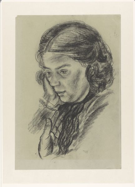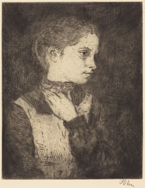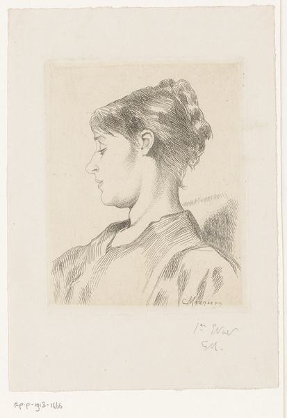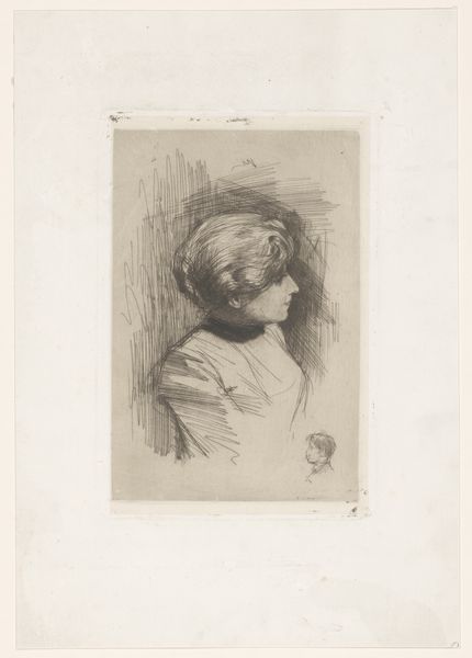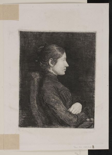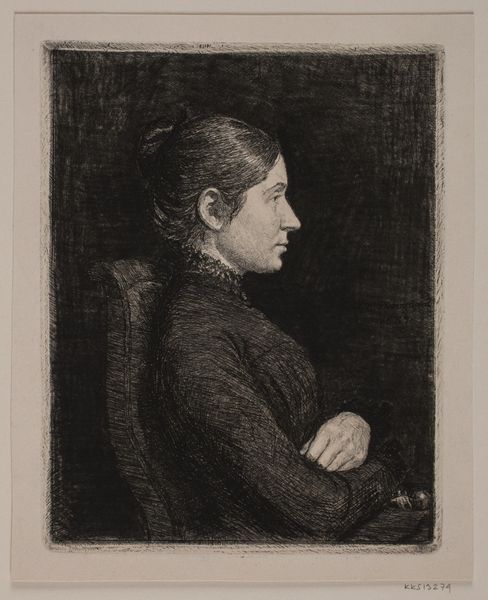 Editor: Here we have Niels Skovgaard’s "Faster Cathrine," an etching from 1884. It feels incredibly intimate, like a stolen moment. The lines are so delicate, but they create a powerful sense of quiet introspection. What do you see in this piece? Curator: The intensity is striking, isn’t it? Though rendered simply, "Faster Cathrine" holds a depth of symbolism. Her averted gaze suggests a disconnection, or perhaps a deep inner contemplation. This image captures more than just a likeness; it's hinting at Cathrine’s psychological space. Notice the stark contrast between the light on her face and the dark background. Where do you think the artist wants us to focus? Editor: Definitely her face. The contrast makes it the focal point. So, her averted gaze and the light emphasize her inner thoughts. Do you think there's a specific meaning to that expression, like sadness or longing? Curator: Perhaps. Or even defiance. The realism style here provides not only a depiction, but also a cultural context. Images such as these preserve memory. She is not looking at us. Instead, her look might preserve a different emotional geography. The symbols are embedded within, such as hairstyle, dress, and the simple lines creating powerful emotional weight. What else is present to your view, if you focus on the psychological presence this image evokes? Editor: That's fascinating! Now that you mention it, there’s a resilience in her posture, even though her expression seems withdrawn. It's like she's guarding something precious. Thank you for sharing. It has really changed how I see the print! Curator: My pleasure. Art provides the cultural mirror through which we understand and connect with the emotional terrain of ourselves, and others.
