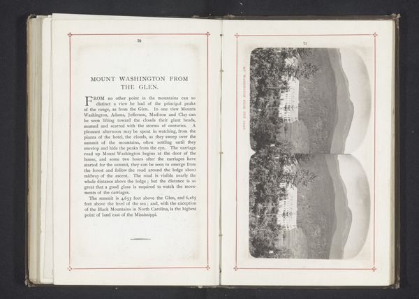 This stereograph, "Gezicht op een vallei vanaf Mount Washington", possibly made by the Bierstadt Brothers, presents a dual, nearly monochrome view of a valley, inviting a formal analysis of its composition and structure. The photograph's impact lies in its interplay between light and shadow, which defines the rugged terrain. The stereoscopic effect creates depth, drawing the eye into the valley below. Notice how the line of the mountain ridge is rendered with sharp contrasts which meet the soft, muted tones of the sky to create a sense of vastness. The two-part structure introduces an element of repetition, which might evoke a sense of scale and distance. This approach invites consideration of the sublime, where overwhelming natural forms challenge human perception. The choice to create a stereograph, one could argue, engages with emerging ways of thinking about space and perception, suggesting a shift toward new forms of representation. We are left to contemplate how such compositions not only reflect but also shape our understanding of the world.