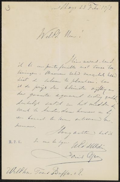 Curator: Here we have Louis Apol’s “Brief aan Frans Buffa en Zonen,” dating from 1860 to 1899, a drawing in ink on paper. Editor: It’s fascinating how intimate a letter can feel, even as a reproduced image. I'm struck by the elegance of the handwriting, and the almost musical quality of the lines. It feels very personal, even romantic in a way. As someone deeply committed to Formalism, how do you read this letter, stripping away the sentimental for its core visual components? Curator: The line is the primary element at play here. Note the varying thickness and pressure – the controlled modulation reveals much. Can you discern how the artist structures space through line alone? Editor: I notice how the deliberate flourishes add a decorative element, elevating the letter beyond mere communication. It is not just writing but an aesthetic display, though I cannot fully understand the script itself. The flow seems vital, but the overall effect on the neutral field is calming. Curator: Precisely. The work contains an exquisite balance of positive and negative space. Also consider the material substrate: the paper itself offers a certain texture and tonal value against which the ink performs. This play with figure and ground can be appreciated whether or not one is fluent in its written language. Observe how form dictates function while exceeding pure linguistic purpose. Editor: So you're saying that even without reading the words, the artwork's impact remains due to the interplay of formal elements like line, space, and texture? That almost separates its inherent aesthetic qualities from the purpose it originally served. Curator: Yes, we can regard the aesthetic value as somewhat autonomous within this system. The semiotics of this calligraphy exist but aren't mandatory to decode in order for visual satisfaction and formal appreciation to exist. Editor: I’ve certainly learned to consider beyond legibility with works incorporating language! Looking beyond pure conveyance and observing such elemental features as line alone opens new perspectives, indeed. Curator: Indeed! Shifting focus, what did you gain today about seeing intrinsic structure informing perception, even apart from subject matter?
