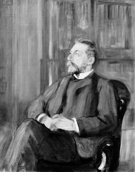 Curator: Here we have Boris Kustodiev's "Alexander Benois," dating back to 1911. What strikes you first? Editor: The restricted palette creates a very somber mood. It feels weighty and serious. I wonder what choices influenced this decision? Curator: The portrait’s monochromatic approach is a potent symbolic choice, distilling Benois's essence down to fundamental elements. Perhaps Kustodiev aimed to capture the intellectual rigor of his sitter? The limited color could reflect Benois’ focused dedication to the arts and history. Editor: Or could the restricted palette be about economy? Russian avant-garde artists were known for ingenuity with limited resources. Was using mostly charcoal and a bit of impasto a pragmatic or aesthetic choice, or perhaps a combination of the two? How much did access to specific pigments shape art-making decisions? Curator: It's compelling to consider resource constraints influencing form, especially within the Russian avant-garde, but I see in Benois's pose—his hands clasped thoughtfully, his gaze directed slightly upward—a timeless representation of intellectual contemplation. Kustodiev, with the symbols surrounding Benois in his study, positions him within a lineage of thinkers. Editor: Right. You see tradition and legacy; I can’t help but consider the social realities in which these portraits circulated. Think of the availability of materials for the artist and for the patron, the economics behind creating likenesses, who was commissioning whom and why? It all affected choices regarding style, approach and medium. Curator: Interesting! While I'm reflecting on those social and material conditions surrounding this work, I’m equally stuck by how such specific conditions lead to the image’s continued relevance. It continues to offer us some sense of enduring inner life and artistic genius. Editor: Absolutely, and remembering its production—the where, when, and how—reveals not just an artistic creation but also a small lens into early twentieth-century Russian society and artistic processes.