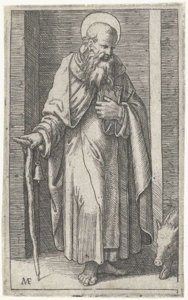 Curator: Let's discuss Lucas Cranach the Elder's depiction of "Saint James the Greater," currently held at the Harvard Art Museums. Editor: Immediately, I'm struck by the density of symbols. The walking stick, the pilgrim's hat... a potent image of journey and faith. Curator: Indeed, the meticulous cross-hatching and woodcut technique Cranach employs here highlight the material process—reflecting the late medieval printmaking boom and the wider availability of religious imagery. Editor: Notice how James is framed by those strangely animate floral borders. They seem to underscore his role as a mediator between the earthly and the divine. Even his eyes seem to look beyond us. Curator: We can also consider the social context. Cranach, aligned with the Reformation, was working during a period where the role of saints was being actively debated. Editor: All this visual language points to a deeper cultural memory. This James connects with centuries of pilgrimage, struggle, and spiritual aspiration. Curator: The materiality then becomes a conduit for broader social shifts. Editor: Precisely. It's quite fascinating how the weight of symbolism can be held within a fairly simple, yet powerful image.
