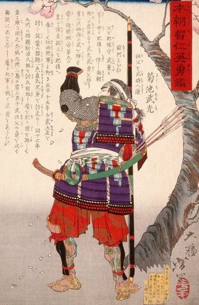 Editor: Here we have Tsukioka Yoshitoshi's woodblock print, "Namikiri Jūzaburō with Drawn Sword" from 1866. The figure's strained pose and visible tension create a sense of urgency. I'm struck by the emphasis on line and flat areas of color. How do you interpret this work? Curator: The materiality of this ukiyo-e print really highlights the commercial aspects of art production. The multiple blocks required for each color, the highly skilled labor involved in carving and printing, the distribution network to get these images to a wide audience—it all speaks to a complex system of production and consumption. How does the inscription, clearly visible to the left of the main image, inform this further? Editor: Well, I notice the text seems to tell a story and almost act as a form of branding for the print. Are you suggesting it acted as an early form of advertising or provided a kind of 'narrative' tied to its sale? Curator: Exactly! The story provides context, entertainment, and perhaps most importantly, value to the commodity. The print wasn’t just an aesthetic object, it was part of a larger cultural and economic transaction. It also allows us to reflect on its cultural context. Consider, for instance, how the woodblocks were reused, altered, or even destroyed. These practical choices about labor, the economy of the studio, or cultural value, impacted which of Yoshitoshi's designs would continue to exist in the future. Editor: So, we're not just appreciating the final image, but also the entire material and production process behind it, and its implications! That's fascinating! I will consider that every print embodies economic considerations and social exchanges. Curator: Precisely! The social and historical context embedded in its very materials!