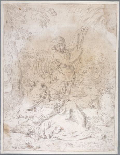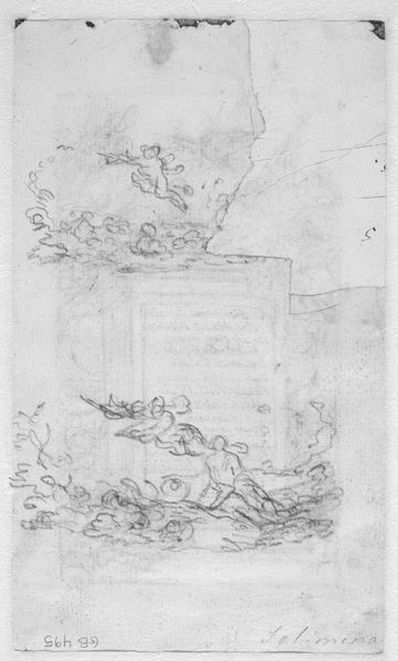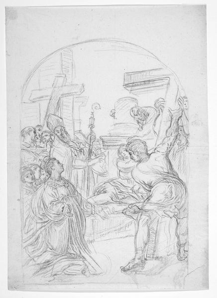Curator: The frenetic energy practically leaps off this small drawing, just over 7 by 7 inches. Editor: It feels like a half-remembered nightmare, all swirling forms and desperate gestures. Curator: This is "Soldiers Charging" by Francesco, called Cecco Bravo Montelatici, part of the Harvard Art Museums collection. The lack of definition almost makes it feel archetypal, doesn't it? Editor: Absolutely. The charging soldiers, the fallen bodies – it's a scene of conflict that resonates across cultures and time. What about the archway? Is it meant to signify anything? Curator: Perhaps a gateway to another world, or a representation of the thin line between life and death in battle. The figure framed within it seems almost like a specter. Editor: A visual symbol of the before and after? An interesting take. I’m left thinking about how we use images of conflict to instill both fear and a kind of grim heroism. Curator: Right – it's all about context and how we frame these narratives. Editor: Precisely. Thank you for clarifying some of my initial impressions.