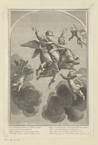 Editor: So, here we have "Winged genius holding the Crown of Tuscany in his left hand and a palm in his right," a drawing or print by Cherubino Alberti, sometime between 1620 and 1700. The details feel so delicate. It’s a whimsical image, and I’m curious—what first strikes you when you look at it? Curator: Ah, yes. What first strikes me is how confidently the little cherub marches across the sky! There's something almost audacious about him, carrying these heavy symbols of power as if they were mere toys. You know, artists during this period, right after the Renaissance, were obsessed with allegory. Everything had layers of meaning. But the sheer *cheekiness* of this little fellow. Is he really old enough to be holding the fate of Tuscany in his chubby little hands? Editor: Cheekiness, I like that! The way you phrase that reminds me of putti, Renaissance babies with wings and often a little sassy… Was Alberti intentionally being irreverent, or simply playing with classical imagery? Curator: Possibly a bit of both. Remember, the Baroque loved drama and a good twist. This *putto*, if we want to call him that, is less about pious devotion, and more about a spectacle, perhaps commenting on the fragility of earthly power. Are those clouds supporting him, or threatening to swallow him whole? And the Latin inscriptions... "Digna Solo Regnare" - "Worthy alone to reign," followed by "Per Astrar Orbem" - "Through the stars, the world." Lofty words indeed. I find it quite suggestive. Does the weight of all that pomp sit lightly with the crown or will it take flight beyond earthly dominion? What do you make of the perspective of the Genius in motion across a temporal setting, a child in the heavens as the past marches towards the future? Editor: It feels almost contradictory; he's weighty but also light, earthly yet ethereal. So much packed into one tiny, winged figure. Thank you, this has certainly reframed how I see the image. Curator: And for me! Sometimes, all it takes is looking at an image from a new angle, questioning its assumptions, to see its true richness… and perhaps its silliness, too.