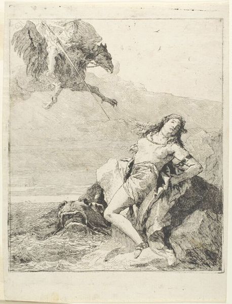 Curator: Here we have Giovanni Domenico Tiepolo's etching, "Angelica bedreigt door zeemonster wordt bevrijd door Ruggiero op hippogrief," created between 1757 and 1760. Editor: The composition really grabs you. The light etches create a dramatic contrast between the frantic energy of the winged horse and the seemingly defeated Angelica chained to the rocks. You can feel the texture in the monster's skin. Curator: This piece captures a dramatic scene from Ariosto's epic poem "Orlando Furioso," a popular subject during the Baroque period. It's essentially a rescue narrative. Look at Angelica, the damsel, victimized and offered up for sacrifice. What are the social dynamics at play? What commentary is being made about gender and power in art? Editor: Absolutely. And let’s not ignore the technique of the etching. Think of Tiepolo meticulously working on the copper plate, controlling the acid to create the image in layers. There is an artisanal aspect that underpins this work's material value, especially given its mass production potential at the time. This intersection of craft and myth is something important. Curator: Right. Mass production also made it possible to democratize a traditionally exclusive narrative and challenge pre-existing structures in which only wealthy patrons can contemplate the "true beauty." Editor: And yet the cost, the very material substrate upon which this story lives. Was it made accessible to Angelica, metaphorically? Consider how the raw materials shape its socio-economic reality, what the means of production were... Who was exploiting what labor to create the media of this image? Curator: That is insightful. By acknowledging that complexity and by recognizing how social power and materiality were always deeply interwoven in the historical narrative—through production, distribution, and even through visual storytelling—we can gain so much understanding. Editor: Seeing this piece from the perspective of its creation adds so many more layers. Understanding the material gives one greater appreciation for what it portrays.