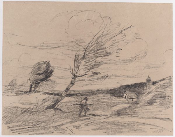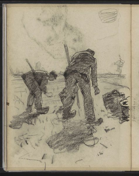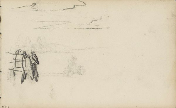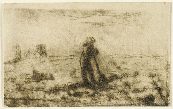 Curator: Looking at this spare composition by Niels Bjerre, created in 1886, a drawing rendered in pencil... it certainly evokes a sense of quiet desolation. Editor: Yes, and even a touch of the monumental in its understatement. A lone figure on a small rise overlooking a seemingly endless space, executed with minimal yet effective lines. Curator: Precisely. The horizontality of the scene, punctuated by the single verticality of the figure, establishes a clear compositional hierarchy. The eye is led from the darkness of the foreground mound towards the pale horizon, bisected unevenly across the sheet. Editor: It feels significant, that human presence merging almost invisibly with that open plane beyond. Shell middens themselves speak of cyclical consumption and gradual accrual—to smooth one seems almost a sacrilege against cultural memory. Curator: Or a reconciliation? A visual flattening mirroring the literal smoothing. Notice how Bjerre uses varying pencil pressures to define depth and texture; the heavy strokes delineate the mound against the more airy and ambiguous distance. It is a masterclass in controlled tonal range. Editor: And the single figure contributes significantly to this sensation—almost stoic—smoothed also by tonal continuity, set to face the same direction as the space. Is she tending a grave? Waiting hopefully at dawn? The enduring strength of visual art is that each will always come away with an image of themself. Curator: A beautiful ambiguity, facilitated by Bjerre's economic employment of the medium. He presents us with the essence of landscape, distilled through the lens of human activity, an attempt to capture form at all. Editor: I find myself drawn to think about those mounds—symbols and memories slowly smoothed, and of the ever shifting shoreline, always subtly reformed across an immeasurable time. Curator: Yes, its simplicity allows the viewer's own internal narrative to populate the scene. The figure does the mundane and stands for the world and does both things meaningfully. Editor: Absolutely. What at first glance might seem like a stark image opens into a wealth of possible interpretations, thanks to Bjerre’s refined control and suggestive composition.