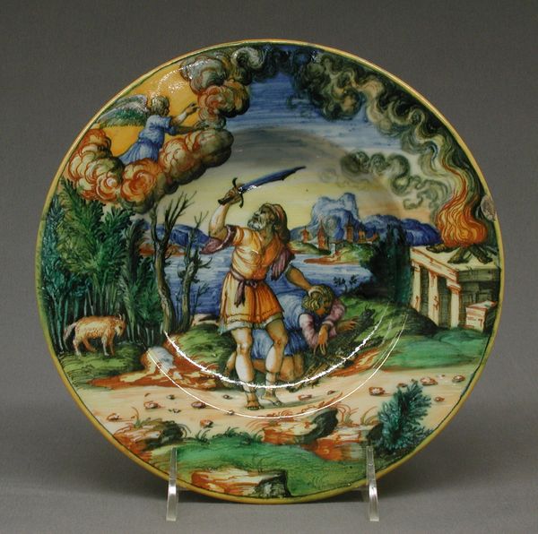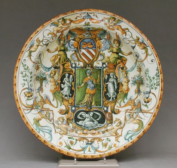 Editor: So this "Dish," made of earthenware by Bernard Palissy in the 19th century, is currently housed at the Met. What immediately grabs my attention is the scene in the center—it’s very classical and idyllic. How would you interpret this work? Curator: Beyond its aesthetic appeal, I see this piece as deeply intertwined with questions of power and representation. Palissy's work, while celebrated, was created within a historical context rife with social and political inequalities. Considering the figuration within the dish – can you decode any underlying power dynamics in how men, women, and even nature are portrayed? Editor: I suppose the central female figure has a classical, almost statuesque, quality that might signify something about status? Curator: Exactly. Consider how classical ideals, often rooted in patriarchal structures, were used to legitimize certain social orders. The careful arrangement of figures within a landscape setting… Is that harmony genuine, or does it obscure the exploitation of natural resources, perhaps the labour needed to even create such art? Think about how display is linked to luxury, wealth and social status. Editor: It's interesting to consider the labor that went into its creation, and how that's maybe obscured by the finished product. Curator: These ornate platters would have served a decorative, rather than functional, purpose and could serve as a form of one-upmanship among wealthy collectors. The "Dish" could become less a depiction of classical values and more an argument against the prevailing values that caused social issues. How can decorative arts, seemingly harmless, perpetuate inequality? Editor: Wow, I never would have thought of that! Now, I’m seeing it as much more than just a pretty plate. Curator: Absolutely! Art doesn't exist in a vacuum, does it?