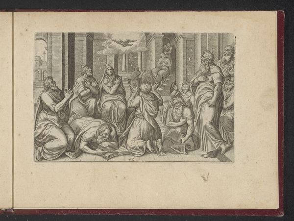 This is Philips Galle's engraving, "Opwekking van Lazarus," created around the late 16th century. The composition, dominated by fine lines and shading, evokes a somber yet miraculous atmosphere. Galle masterfully uses the contrast between light and shadow to direct our attention to the central figures: Lazarus emerging from his tomb and Christ, who stands tall. The lines, meticulously etched, define the folds of the clothing and the texture of the rocky landscape, creating depth and movement within the restricted monochrome palette. The semiotic weight of this image lies in its challenge to fixed states. Death, symbolized by Lazarus bound and entombed, is destabilized by the potent figure of Christ. Through formal elements, Galle visually articulates a narrative of transformation, challenging our understanding of the boundaries between life and death. The artwork operates within a structured religious discourse, yet it also destabilizes these established meanings through its emphasis on visual and emotional impact. It allows for continuous re-evaluation.