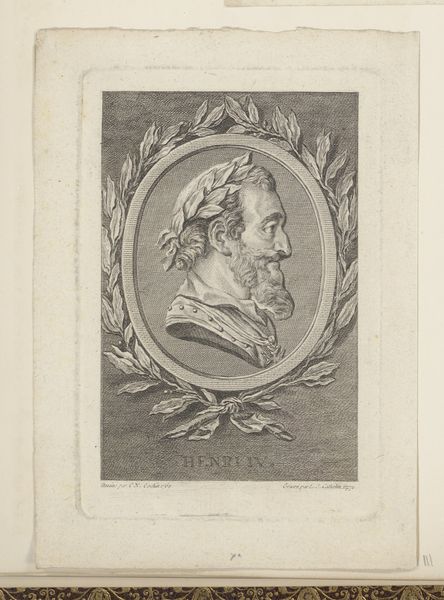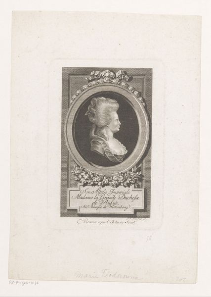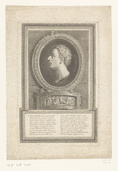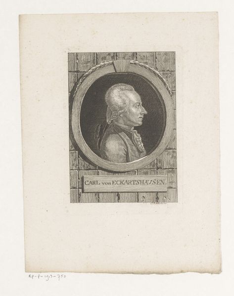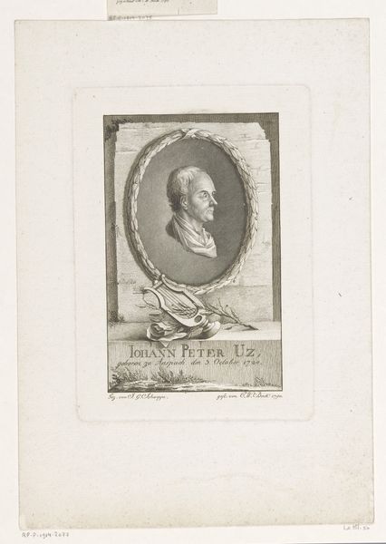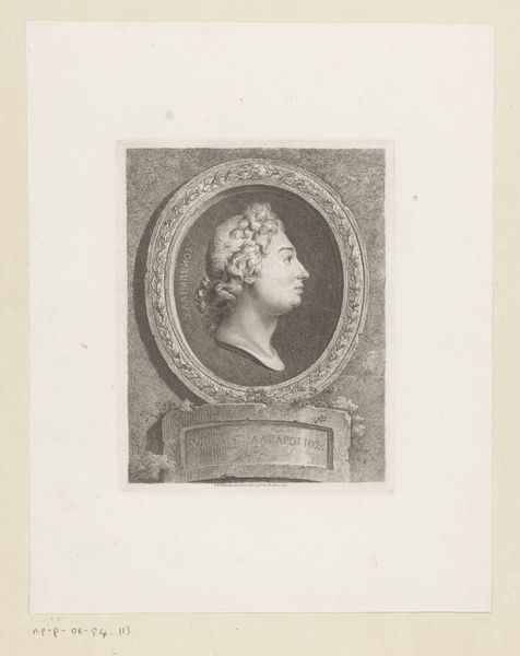 This is a self-portrait etching by Andreas Leonhard Moeglich. The print is dominated by the circular frame of the portrait, creating a sense of classical order and containment, and softened with an organic background of foliage. Note how the lines of the face, from the forehead to the nose and chin, are meticulously defined, suggesting a rational, enlightened sensibility. Below, the rectangular tablet further underscores this classical aesthetic. Yet, the artist disrupts this formality with the softer textures of the hair and the background, introducing a dynamic interplay between order and nature. Consider how Moeglich uses these formal elements to position himself within the intellectual currents of his time, embracing classical ideals while acknowledging the romantic allure of the natural world. Through this convergence, the print challenges a singular interpretation, inviting ongoing dialogue and personal reflection.