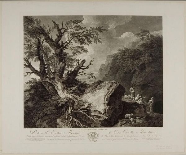 Curator: This etching, "Landscape with Fishermen on Shore," was created by Antoine de Marcenay de Ghuy in the 18th century. Editor: It has a rather melancholic feel, don't you think? Like a stage set for a gothic novel, all craggy rocks and looming shadows. Curator: Indeed. Ghuy, active in court circles, often engaged with idealized landscape traditions, though this piece also showcases a fascination with the sublime. Editor: It’s interesting how he frames the scene with that almost theatrical cave mouth. It gives the impression of peering into another world, one filled with danger and the promise of adventure. Curator: The contrast between the detailed foreground and the misty background effectively conveys a sense of depth, doesn’t it? It speaks to the influence of artists like Claude Lorrain. Editor: Yes, but with a darker edge. It's as if he’s inviting us to contemplate the fragility of human existence against the backdrop of nature's grandeur. Curator: A fitting reflection on the Enlightenment's complex relationship with nature—both admired and feared. Editor: Absolutely. A view that transcends any singular historical context.