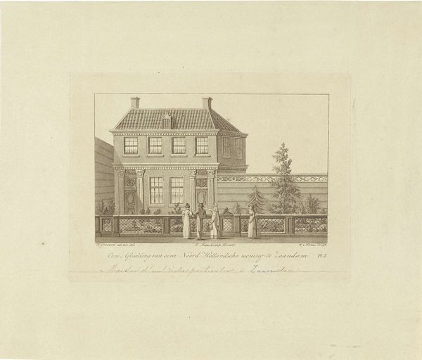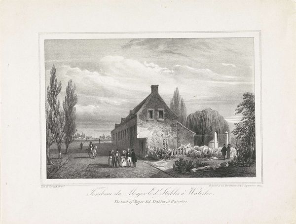 Curator: This print, attributed to V. Lignian and dating from between 1820 and 1850, is titled “Graf van Edward Stables te Waterloo,” or “Tomb of Major Edward Stables at Waterloo.” It appears to be an engraving. Editor: My first thought? Peaceful. And melancholy, in a way. It has the hushed feel of a place left behind, though it has a certain beauty, don't you think? Curator: Certainly. The composition, divided neatly into thirds, horizontally and vertically, balances the weight of the architecture with the ethereal sky. Notice the meticulous cross-hatching, a typical technique for creating tonal variation in engravings. The image invites semiotic reading regarding commemoration and the stoicism associated with neoclassical ideals. Editor: True, I see the neoclassical elements… but something about that drooping tree—it pulls at you, doesn't it? It almost hides a little fenced-off enclosure, like it's keeping a secret. A rather sorrowful secret. And those animals up front, do they represent…stability? Curator: Intriguing interpretation. Formally, the animals do provide a grounded foreground, juxtaposed with the geometric rigidity of the buildings. This tension serves to question our preconceived notions regarding life versus death. Editor: And there are these seemingly rough textures in the building against a calm skyline, creating, perhaps, tension or contradiction. Is it simply documenting the Tomb of Major Stables? What does it *mean* to draw an old building at all? Curator: Precisely. The tension underscores the complex relationship between the concrete and the abstract, historical specificity and universal themes, allowing for varied responses such as ours. Editor: So, at the end of our musings, it seems to me this simple print resonates with an intriguing power. Beyond its classical facade and somber presentation. Curator: A well-conceived impression indeed. I conclude that its inherent compositional complexities offer far more than a simple commemorative image.