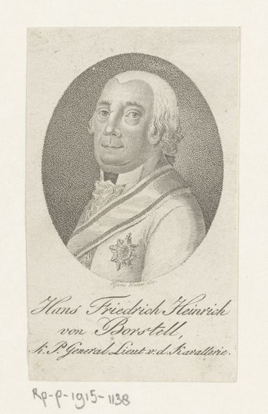 This is a portrait of Willem I Frederik, King of the Netherlands, made by Benjamin Samuel Bolomey. It’s an engraving, so the image was incised into a metal plate, probably copper, inked, and then printed onto paper. Now, think about that process. Each line you see was physically carved by hand. The artist wasn’t just representing the King; he was engaged in repetitive, painstaking labor. This wasn't just a matter of artistic vision; it was about craft, skill, and time. The very act of reproducing the King's image through printmaking speaks to the social context. Engravings like these were a form of mass communication, spreading the King's image far and wide. In a sense, this print is a piece of propaganda, carefully crafted and disseminated. When we look at this portrait, we're not just seeing a likeness. We are seeing a record of labor, a testament to the power of print, and a window into the social and political landscape of the time. It reminds us that all images, even those that seem straightforward, are deeply embedded in material processes and social relations.