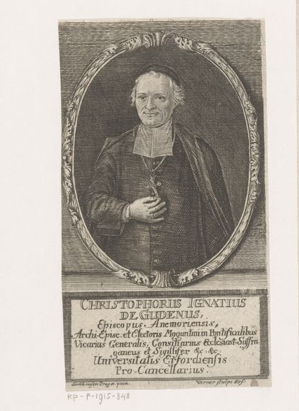 Curator: My initial feeling looking at this portrait is a certain… gravity. The way the light catches the gentleman's face suggests someone burdened with responsibility. Editor: That's a fascinating read, let me tell you a bit more about the context. What we have here is an engraving titled "Portret van Ludwig Friedrich von Beulwitz," created in 1792 by Paul Wolfgang Schwarz. This print captures Ludwig Friedrich von Beulwitz, and it definitely places him within a very specific socio-political sphere. Curator: The oval frame adorned with what looks like a laurel wreath also gives off a particular aura. The laurel, of course, symbolizes triumph and honor. It seems to me, the artist is intentionally building layers of symbols around the image of the person. It reinforces the sitter’s importance and possibly connects him with idealized ideas of the Classical era. Editor: Absolutely. It’s essential to consider that it falls within the Neoclassical movement, drawing upon those artistic and intellectual trends in 18th-century Europe. We should also consider class, and its function in promoting societal elites. This kind of image was definitely not available to everyday folks. Curator: Precisely, notice the elaborate garments— the detail, and his official regalia all indicate high status. But it’s more than just the depiction of power; the texture achieved through the engraving technique almost suggests a sense of lasting legacy. These types of prints are themselves important cultural markers that have become objects of historical interest. Editor: I wonder about the choices that position Ludwig Friedrich. The portrait becomes a site to negotiate identity within this historical moment. Are we meant to critically assess who has historically occupied spaces of power and privilege, and who has been systematically excluded? Curator: The symbolic value endures precisely because it allows the viewer to place him in his place and time. This engraving invites reflection, if not direct dialogue, with figures from our past who remain influential. It's a looking glass for past-and-present analysis. Editor: And as a tool for sparking critical dialogue about power and representation—it reminds us to think deeply about history.
