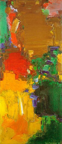 Editor: This is Hans Hofmann’s “Kaleidos” from 1958, an acrylic painting. The composition is essentially stacked rectangles and squares. I’m curious about the title because while “kaleidos” suggests fractured reflections, this feels more like an assertive construction. What do you make of it? Curator: It's fascinating how Hofmann uses geometric forms and color so boldly. Given your thoughts on the title, does this then remind you of a city plan perhaps, with the shapes suggesting buildings and roads? The colours evoke an emotive urban feel, wouldn't you agree? Editor: Yes, I can see the urban connection. The way the colors interact feels very Fauvist, creating a push-pull effect with depth and surface competing. There are those grounded, earthy hues right next to vibrant, almost jarring, colours. Curator: Absolutely! Now, think about this “push and pull” as Hofmann’s signature characteristic in Abstract Expressionism, as something deeply psychological: what could these visual dynamics reveal about post-war society, perhaps a sense of being pulled between tradition and the new? Editor: That’s interesting. Maybe the geometric forms represent a desire for order while the clashing colours express the anxieties and contradictions of the time. Curator: Precisely! Visual symbols evolve and carry new weight over time. So what started with colour can eventually convey a profound message regarding society. This definitely gives us a new perspective on what is otherwise considered abstract work. Editor: This reframing truly allows us to engage on a much more complex and compelling level. Curator: Indeed, there is so much more that symbolism has to offer when experiencing visual art and cultural artifacts.