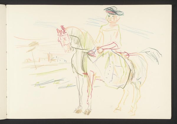 This is "Amazone met begeleider," an undated etching by Isaac Israels. Israels, a Dutch painter known for his impressionistic style, captures a scene of leisure and privilege. Here, we see a woman, elegantly dressed and seated confidently on horseback, accompanied by an attendant. The etching technique lends a sense of immediacy, as if we are catching a fleeting glimpse of a specific moment in time. The presence of the attendant underscores the social and economic disparities of the era, as equestrian activities were largely exclusive to the upper classes. The woman's poised demeanor contrasts with the implied labor of her companion, hinting at the complex interplay of gender, class, and power. Israels himself occupied a unique position in society, moving within artistic circles while also engaging with themes of modernity and social change. This artwork presents an opportunity to consider how leisure activities, like horseback riding, were shaped by and reflected societal norms and power structures, offering a glimpse into the emotional lives of the subjects depicted.