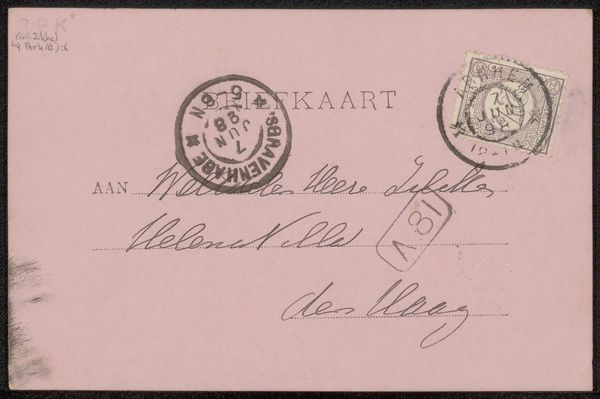 Curator: This is "Briefkaart aan Philip Zilcken," a postcard potentially dating back to 1898, by Bart van Hove. The medium is ink on paper, executed with a pen. It resides here at the Rijksmuseum. Editor: I'm immediately drawn to its intimacy; it feels like a direct connection to a moment in time. The handwritten script, the faded ink... It speaks volumes, even before deciphering the words. Curator: Precisely. The materiality itself is crucial here. Think about the accessibility of postcards during that era—mass-produced paper, affordable postage. It democratized communication, allowing for a more transient exchange of ideas and information outside the sphere of what might have traditionally been recorded or valued as art. Editor: I'd argue that it also tells a story about class and social mobility. Who had the leisure and means to correspond in this way? What networks were being cultivated through these seemingly mundane exchanges? Curator: We know that van Hove, coming from a family steeped in artistic labor—his father was a master of the drawing academy—would have deeply understood the means of pictorial production from start to finish. It makes me wonder about the kind of ink he used and the specific type of pen, even the source and production of the paper. Editor: And let’s think about Zilcken, the recipient. These postal artifacts circulated amongst networks involved in arts and culture. As art practitioners, the labor is the culture! Also, notice how the postal marks function both to enable commerce and establish institutional authority. Curator: Indeed. Those stamps, the postmarks – they are physical markers of its journey through the postal system. Each mark and scratch tells a small story about process and human handling. It shows this object had utility, to convey a message; the art is almost secondary. Editor: While seemingly informal, there's still a performative aspect to communication in that historical moment. Gender, societal roles, the construction of relationships... all mediated through this material exchange. Curator: Absolutely. I think what's so compelling is how much information a simple object can hold about the everyday labor of living in the late 19th century. We get so accustomed to instantaneousness today that physical letters or notes seem ancient! Editor: Precisely, seeing how it has lasted for a century calls our present into question. I leave appreciating both what was sent and how it made it into the museum.