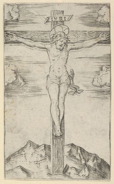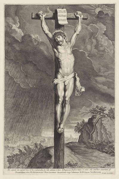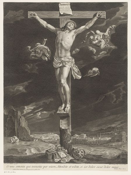 This print of the Crucifixion was made by Robert van Audenaerde, a Flemish artist active in the late 17th and early 18th centuries. It’s an engraving, meaning that the image was incised into a copper plate, inked, and then printed onto paper. Notice the extraordinary detail that Audenaerde was able to achieve through this laborious process, and the contrast between light and shadow. This tonal variation is created by making many tiny cuts into the metal. The overall effect is pictorial, almost like a photograph. But the means of production are crucial to understanding the image. Engraving was a highly skilled, time-consuming craft that required years of training. The resulting prints were luxury goods, circulated among a relatively small, elite audience. This connects with the wider social context: the cost of materials and labor involved in the production process. The image stands as a testament to the enduring power of skilled handwork. By focusing on the making of this print, we can appreciate the cultural values and artistic traditions that it embodies, challenging any strict divide between art and craft.
