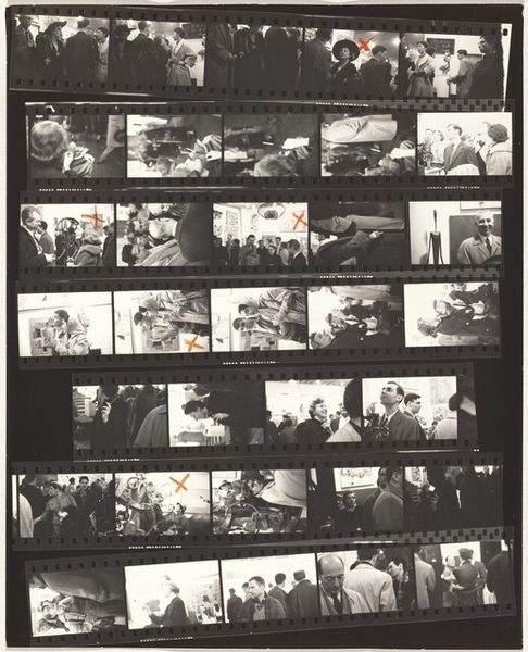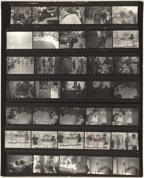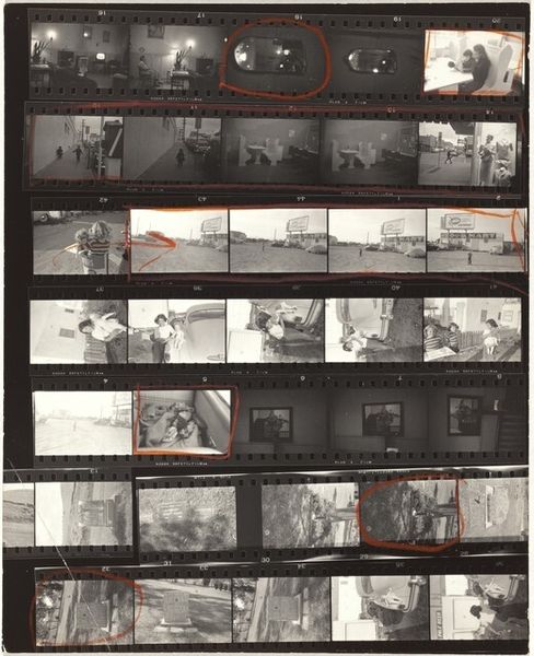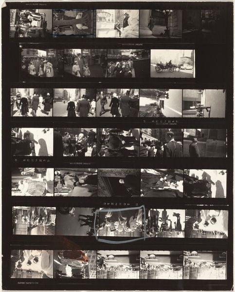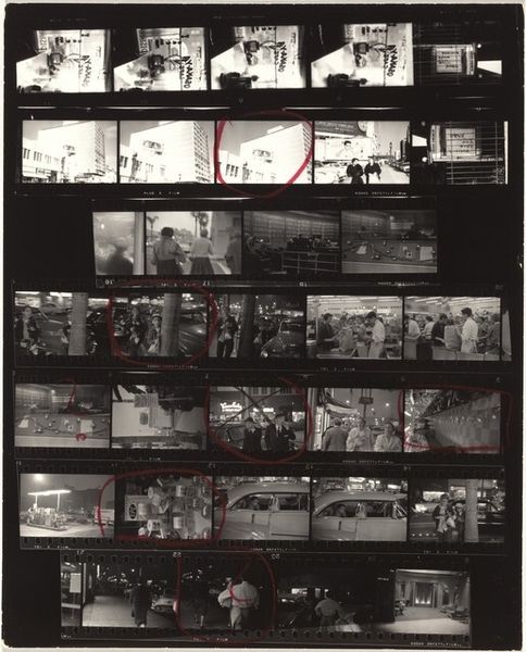 Robert Frank made this contact sheet, Guggenheim 445--Los Angeles, using gelatin silver. It’s a matrix of moments, a storyboard of almost-visions that asks what we look at, and how. The blacks are dense, the whites burn, like memory itself. The grit is palpable; you can feel the grain pushing against the glass. Look at the third strip down, that couple framed by a tunnel; the image feels like a half-remembered film still, all shadows and suggestion. The way the light flares around them, it's like they're caught in the act of disappearing. Frank, like his contemporary, Helen Levitt, made the street the stage for his existential theater. Both of them remind us that art isn't about answers; it's about the questions we ask, the spaces we leave open.