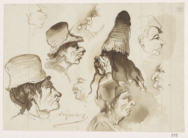 Christian Ludwig von Hagedorn created this delicate etching titled "Seven Heads of Men and an Old Woman." The composition is structured as a grid, but it is softened by the diversity of the subjects. Each portrait is rendered with a remarkable economy of line, varying the texture of the ink to suggest the rough textures of skin, hair, and worn clothing. Light and shadow play across their faces, creating a sense of depth. There's a tension between the formal arrangement of the grid and the expressive, almost caricatured, depiction of individual character. Through this contrast, the artist investigates the relationship between the universal and the particular, the ordering of society and the individual’s place within it. The work’s focus is on the materiality of lines, how they combine, intersect, and create a complex understanding of the individuals portrayed. It raises questions about how meaning is constructed through both representation and abstraction.