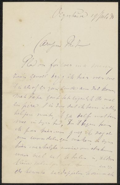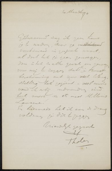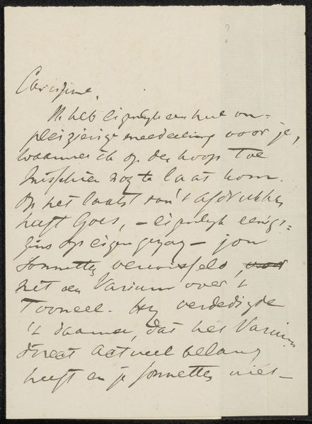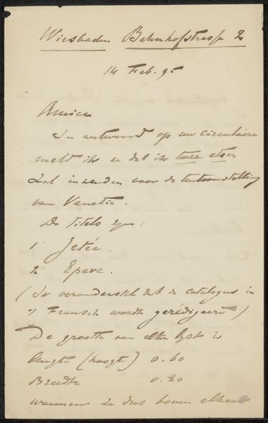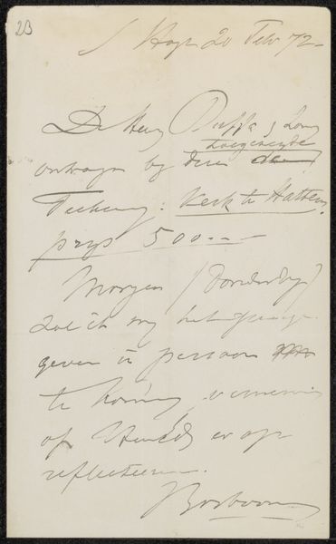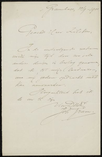 Curator: Today we're looking at "Brief aan Philip Zilcken" by Ferdinand Hart Nibbrig. This piece, dating possibly from 1901 to 1924, is executed in ink, using both pen and drawing techniques. Editor: It strikes me immediately as delicate and ephemeral. The handwriting, while faded in areas, conveys a real sense of intimacy. Curator: Indeed. The materiality speaks to its creation. Consider the paper itself: its quality, its aging, and how they reflect the availability of resources during the period, along with how it speaks to Nibbrig's relationship with his subject. Correspondence was a significant element in artistic and intellectual communities. Editor: The flowing lines of the pen work remind us of calligraphy; however, they seem more driven by impulse, less rigid and precise. There’s a looseness of execution, which perhaps mirrors the casual tone between two colleagues? Curator: Possibly. These works existed within a social fabric. Who were these individuals? What positions did they occupy in the artistic establishment? What sort of consumption practices supported or were supported by it? And is this meant to be high art, or an ancillary element, such as ephemera used in daily life, made by and disseminated within his workshop? Editor: Regardless of whether it was meant to be private or meant to be disseminated in any public manner, I see evidence of emotion primarily: perhaps it's excitement, eagerness or it could equally have been intended to convey seriousness in their exchange, but regardless there's some level of engagement at work. I think of how it resonates visually more so. The placement of the words on the page creates an asymmetrical design. Curator: I concede there is visual engagement, but it needs to be interrogated further within the relevant networks that constituted the artistic system. These processes directly affected the artworks, like how it was sold, reproduced or regarded. These papers may hold invaluable insights. Editor: It really has you consider just how layered these types of 'smaller' works can be, doesn't it? Curator: Precisely! Material conditions are always central when it comes to understanding artwork.