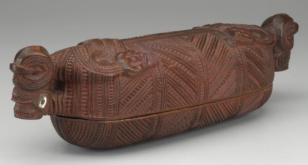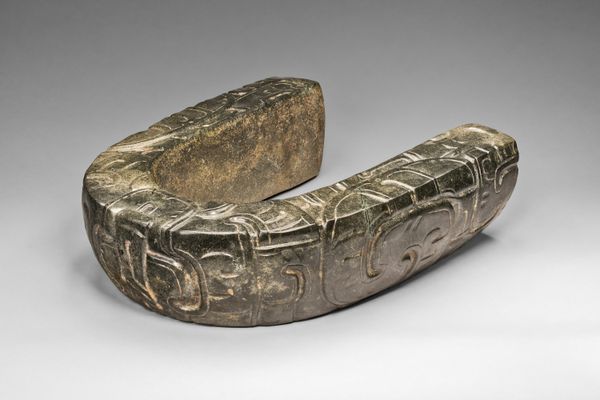Editor: So, this is a fragment of a Ceremonial Ballgame Yoke, dating potentially from 700 to 800, attributed to Veracruz. It's currently housed at the Art Institute of Chicago, carved out of what looks like a dense stone. It gives off such a solemn and imposing vibe, what is your take on this piece? Curator: Well, understanding this fragment requires looking at the broader social function of the ballgame itself. Think of it as more than just a sport; it was a ritual, deeply embedded in political and religious life. The yoke, worn around the waist of the players, wasn't merely protective gear, it was symbolic armor, connecting the player to cosmic forces. How do you see the imagery contributing to that function? Editor: It does look intricate, almost like the relief is trying to tell a story... or multiple ones. Like, each figure seems important. So, are you suggesting the players became vessels for something else during the game? Curator: Precisely. Consider the museum as a space displaying the conquest. This stone's original placement, as an active object in ceremony, would drastically alter its power, no? The figures represented are not simple decoration; they evoke deities, ancestors, and the very cycles of life and death central to Mesoamerican cosmology. What political statements are displayed when these stones were removed from these sites to be in museums. Editor: So much more than padding. Knowing its political function transforms how I understand the craft of it too. Curator: Exactly, what seemed decorative becomes imbued with powerful and political intentionality when considering the context and culture it once lived within. The ballgame, and by extension objects like this yoke fragment, were central in negotiating social and political power. What we have to ask is, what did it mean, or what did it allow these figures and societies to mean when putting it in the eye of the modern art viewer. Editor: This has definitely altered how I view museum artefacts. Now I see them as loaded signifiers that have power beyond just simple appreciation. Curator: Precisely. These artifacts transcend just aesthetics; they tell a complex story of society, politics, and belief that shaped civilizations.