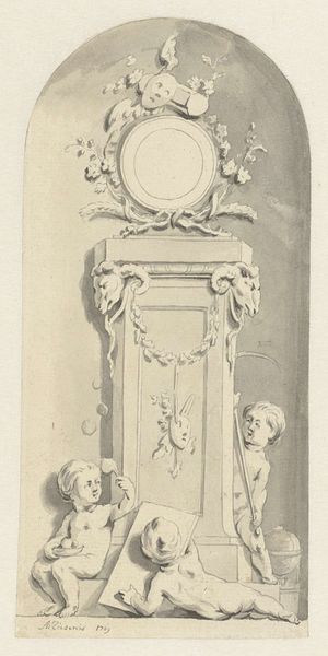 Reinier Vinkeles made this print of Theseus and Romulus sometime before his death in 1816, using etching and engraving. The density of lines creates an impressive range of tone; notice how the artist modulated the light to give the stony architecture a feeling of depth. The etched lines create a burr when the acid bites into the plate. This gives a velvety texture, particularly evident in the background foliage. Vinkeles's skill is also clear in the crisp, clean lines of the medallions themselves. Prints like this played a crucial role in the circulation of knowledge. Before photography, they were the primary means by which images were disseminated. This print would have allowed people to study classical sculpture without traveling to see it firsthand. The labor involved in creating such a detailed print, and the intellectual labor of studying the past, are both embedded in this remarkable work. By appreciating these aspects, we can move beyond simply seeing it as a reproduction, and recognize its own unique value.