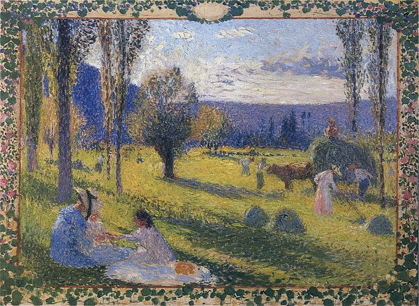 Curator: Standing before us is Henri Lebasque's "Sur les bords de la Marne," painted in 1901. The canvas vibrates with the loose brushwork of Impressionism. Editor: It's such a hazy, summery scene, isn't it? That dappled light makes it feel so dreamlike, almost as if the figures are fading back into the landscape. The figures become ornaments decorating the natural realm. Curator: Yes, it's like he's trying to capture a fleeting moment of leisure and sunlight. You'll notice Lebasque doesn't go for that sharp, photographic detail; it's all about the overall impression. The white dresses stand out; these white shapes serve almost as exclamation marks. The dresses look like ghostly presences. Editor: And how fascinating that those figures in white are mostly turned away. It emphasizes a sense of privacy and introversion even amidst the implied social activity. The woman standing in the field further back almost feels like a symbol. Perhaps innocence, or simply another ornamental component within this composition. Curator: Precisely. They become part of the overall composition rather than being distinct portraits. Lebasque was part of this Post-Impressionist wave, right? Kind of carving his own path, leaning towards the more intimate side of life. Genre-painting, a cityscape that captures that feeling of peace and quiet that many sought outside Paris, or the hubbub of modern cities. Editor: And that use of light reflecting off the water—almost abstract in places—creates such a powerful feeling of tranquility. It’s more than just a representation of a riverbank; it’s a distilled memory of summer afternoons. The brushstrokes look like gentle, short rhythms across the water. He captures those refractions so effectively. Curator: Definitely! This wasn’t meant to be a statement about the world. This picture feels so personal. Lebasque gives the viewers an intimate peek into an unassuming narrative where they have a central part to play. Editor: Well said, It almost feels like you could just step right into the scene and join that lazy summer afternoon! The symbolic resonance of leisure never goes out of fashion. Curator: A perfect little scene from a lost paradise, right? An oasis to remind you what can be found, when you decide to slow down and experience life differently.