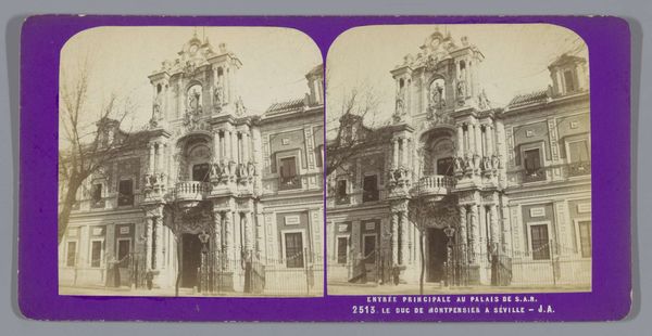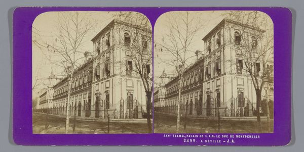 Curator: This albumen print, dating roughly from 1862 to 1876, is entitled “Gezicht op het Palacio de San Telmo in Sevilla," or "View of the San Telmo Palace in Seville," captured by Jean Andrieu. The image showcases the palace bathed in sunlight, a stately building presiding over a classic cityscape. Editor: There’s a curious melancholy about it, don't you think? Even with the abundant light, the building appears deserted, slightly haunted. It’s grand, certainly, but feels utterly still. Curator: Indeed, these early photographs often possess a quality of timelessness mixed with an uncanny stillness. This palace, historically significant, served various purposes including a naval school. Its photographic depiction, then disseminated through prints like this one, played a role in constructing its image, and Seville's image more generally, for a broader European audience. Editor: Andrieu clearly framed it to highlight the palace's imposing size. The bare branches of those trees reach out like grasping claws, accentuating the building's solid geometry against the sky. I wonder if he deliberately waited for a leafless season to emphasize the architectural form. Curator: That’s an interesting consideration. Photography at this time involved a certain amount of staging and awareness of compositional elements. The choice of perspective and even the inclusion, or exclusion, of people was highly considered to create particular social meanings and project a controlled representation. Editor: Controlled, yes, but isn’t there always a hint of chance involved in these things? Look at the light, the accidental placement of shadows... The albumen print technique itself gives it a delicate, almost dreamy quality, doesn't it? Curator: Precisely! Andrieu’s "View" captures more than just architecture. It speaks to the power of image-making in shaping perceptions of history and place. These photographic prints are now documents offering unique access to an era gone by. Editor: It also gives a lovely chance to daydream. What it must have felt like to stand in Seville those many years ago! For me, the artistry comes not just from the architecture or Andrieu’s technique but from how a single still moment can inspire such a feeling of journey, wonder, even quiet longing.