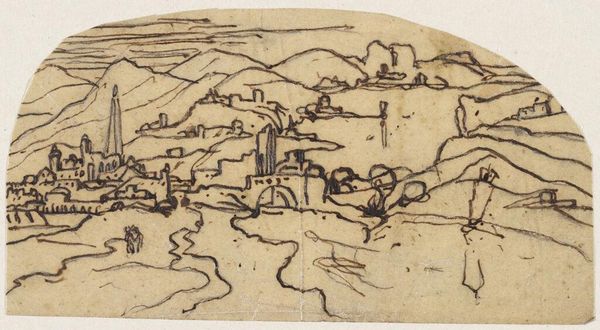 Curator: Looking at Rodolphe Bresdin’s pen and brown ink drawing, “People in a Landscape (Old Testament Subject),” it's striking how he renders such a vast scene on a surface just a few inches across. Editor: It feels almost frantic, doesn't it? The line work is so raw and immediate; you can almost feel the artist's hand moving across the page. Curator: Precisely. Bresdin worked largely outside of the established art system, often struggling financially. The urgency in his drawings might reflect the material conditions of his practice. Editor: And how does the "Old Testament Subject" play into this? Is it about the representation of power, community, or something else entirely within that historical context? Curator: Given Bresdin’s radical politics, it perhaps offers a commentary on societal structures, the hardships and hopes of collective existence. Editor: I hadn't considered that. Seeing the labor involved in the drawing itself shifts how I perceive the labor depicted within the scene. It definitely adds another layer. Curator: Indeed, considering the artist's methods provides a valuable entry point. Editor: I’ll certainly be thinking about the connection between creation and context now.