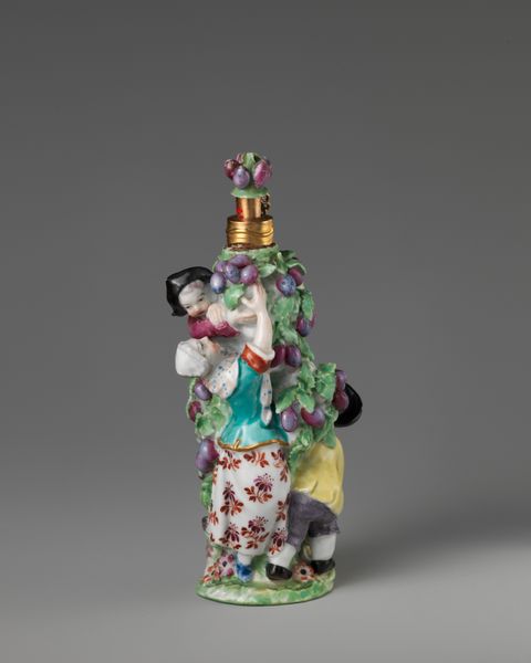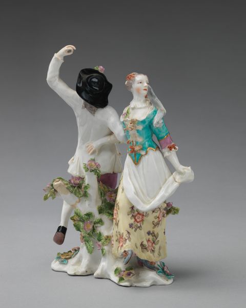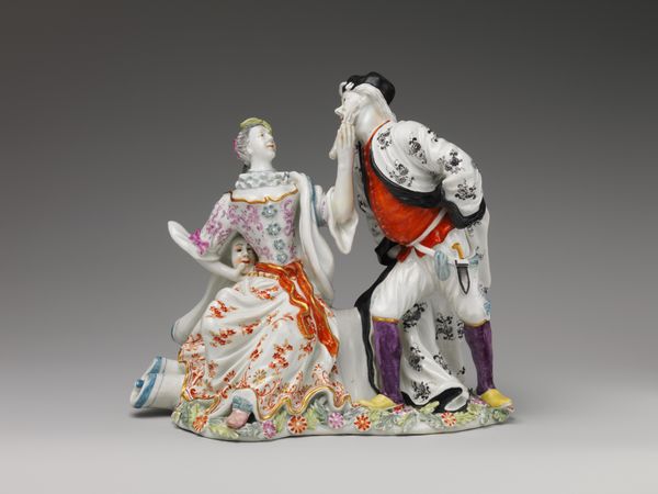 Curator: This exquisitely crafted porcelain sculpture, "Harlequin Family," was produced at the Meissen Manufactory sometime between 1733 and 1745. It is currently held in the collection of the Metropolitan Museum of Art. Editor: What immediately strikes me is the delicacy. It's petite, ornamental…almost frivolous. It screams Rococo! The materiality and those colors—how did they achieve that brilliance with porcelain? Curator: Precisely! Note the artist's skill in rendering the intricate patterns of Harlequin's costume, the diamond shapes, the checks. Observe the composition. The figures are arranged in a pyramidal form, creating visual harmony. There’s a rhythm inherent to the work through the patterning on their garments and accessories. Editor: But look beyond the pattern. Think of the artisanal labour involved. Each tiny piece individually crafted, painted, fired...consider the social stratification this embodies, the wealth needed to commission and display such a piece! Who had the leisure and resources for such intricate work? Curator: One cannot ignore, of course, the underlying commedia dell'arte theme—the playful Harlequin figure. This adds layers of interpretation. Harlequin is typically a mischievous figure; here he is domesticated, part of a family. Editor: But I am more taken by the physical act, the embodied labour of its creation. We must look at the conditions in which the porcelain workers toiled and consider what sacrifices were made to make pieces such as this that signify aristocratic patronage. How were the colors mixed? The molds designed? What of the workers health as they inhaled particles from this fine delicate material? Curator: Interesting… you’ve shifted my view to the craft itself! And to think, all this embodied work now exists preserved here within this sculpture’s harmonious design. The Rococo impulse captured by the Meissen Manufactory so elegantly persists, revealing, even in miniature, our ever complex world. Editor: Exactly! From raw material to precious object—a fascinating insight into not just aesthetics, but the society that shaped it.