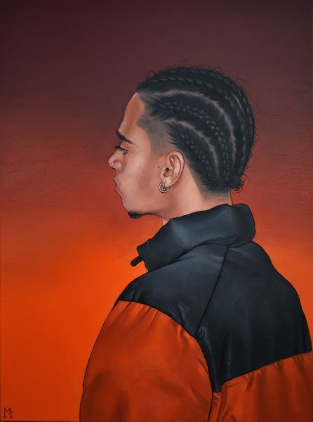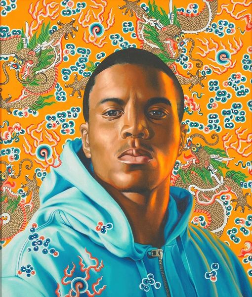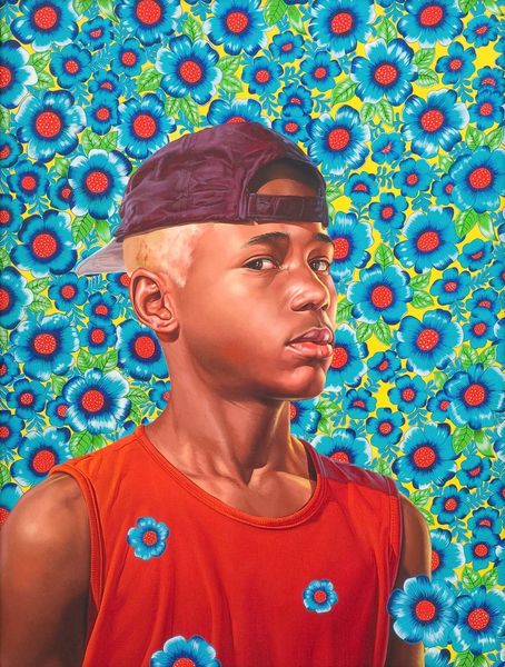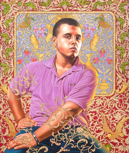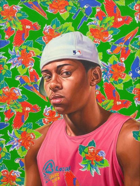 Kehinde Wiley painted this portrait, Thomas Armory I, with oil on canvas. The painting style strikes me, it's like he's remixing old master portraiture with the everyday, and then cranking up the volume with those vibrant colors. Look at how he uses color and pattern, those flat decorative motifs are right up against the super-smooth realism of the figure, and that lime green hoodie with the red floral design. The way Wiley handles the paint is interesting, the face is rendered with such detail and smoothness, but then there's this flatness everywhere else. It's like he's saying, "Hey, I can do both, but which one is more real?" Wiley reminds me a bit of someone like David Hockney, in how he flattens and brightens up the world. But Wiley's got his own thing going on, it is like he's placing young Black men in these traditional settings, it's like he's saying, "We belong here too." And that’s a pretty powerful statement.